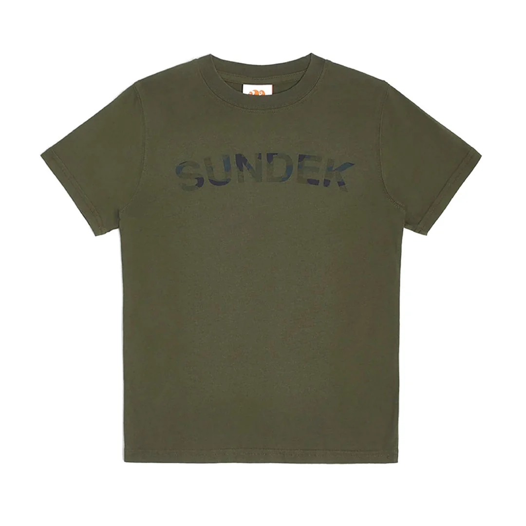 T-shirt bambino a girocollo in cotone jersey. Logo Sundek stampato sul fronte con effetto camouflage. Vestibilità regular.