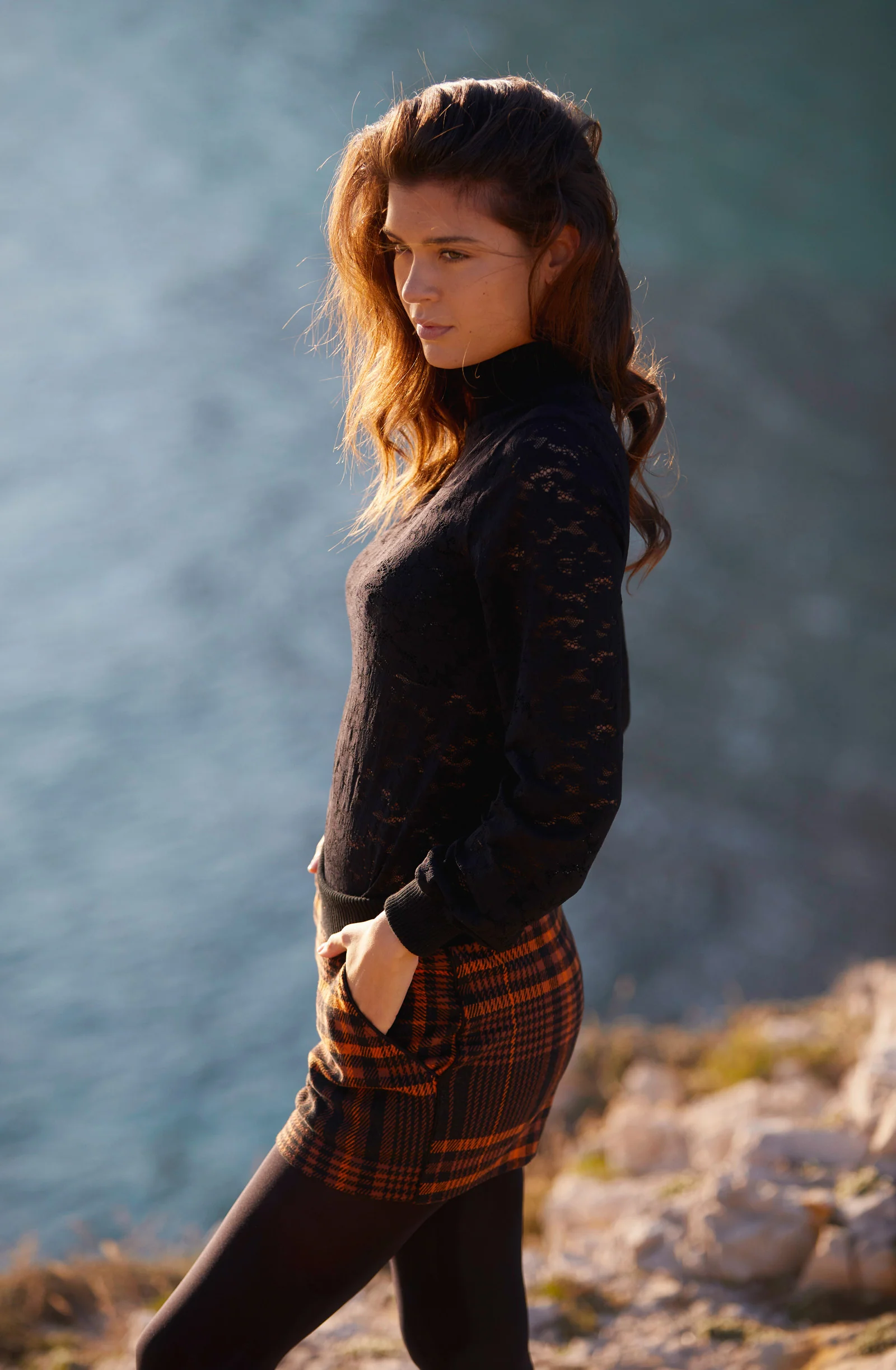 The TARTAN pattern of the shorts SUZEL reveals itself with soft autumn notes. For a working girl style, it can be combined with the black viscose wrap bodysuit BAYLEE that looks like a shirt. To add delicate softness, the black lace of the long-sleeved bodysuit BINGO enhances the silhouette. More casual, the black lace tops play with transparency and opacity: the tank top TEGAN, the ¾-sleeved knitted top GIPS, or the turtleneck top CALIXIA.