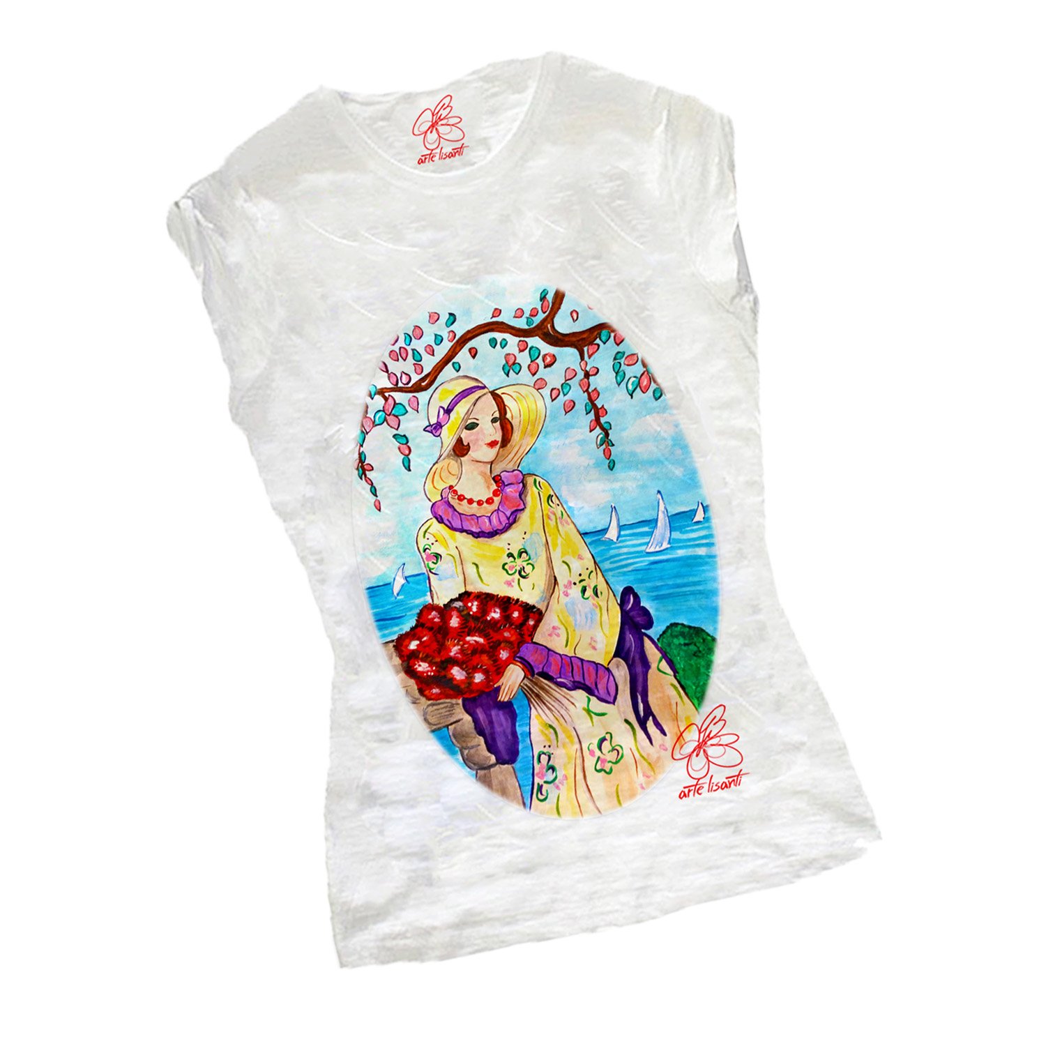 T-shirt dipinta a mano – Al mare: un paesaggio marino alle spalle, delicati fiori e una romantica figura femminile in primo piano.