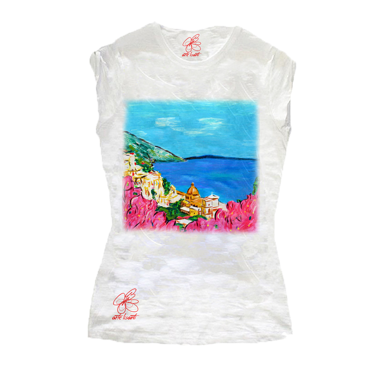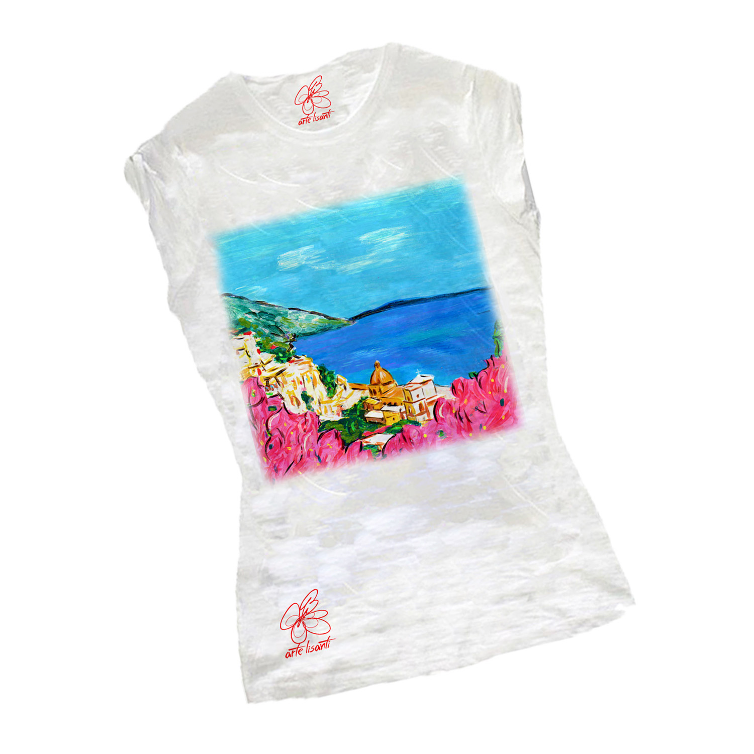 T-shirt dipinta a mano – Amalfi: luogo di incomparabile bellezza naturale della costiera Amalfitana, il mare che l’accarezza e la Boungaville in fiore incorniciano questa colorata T-shirt dipinta a mano.