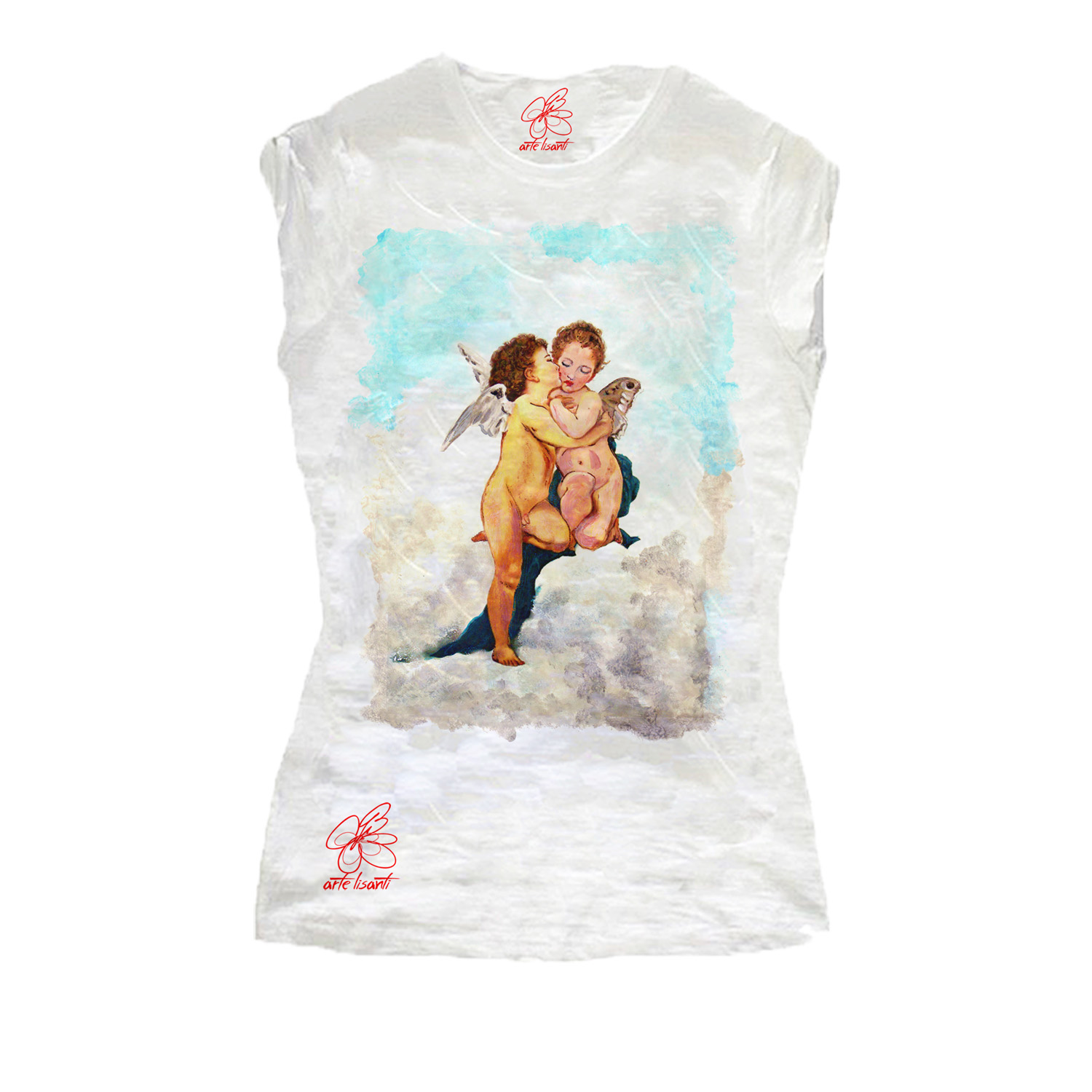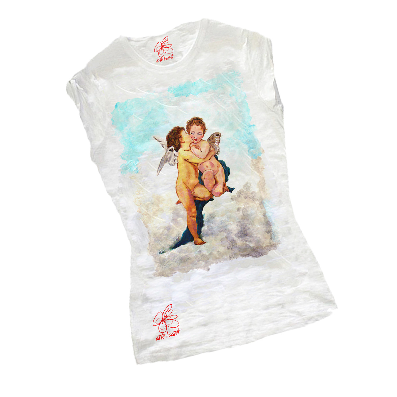 T-shirt dipinta a mano – Amore e psiche: Un delicato bacetto sulla guancia e un abbraccio senza tempo tra le nuvole. Romantica rivisitazione di ArteLisanti.