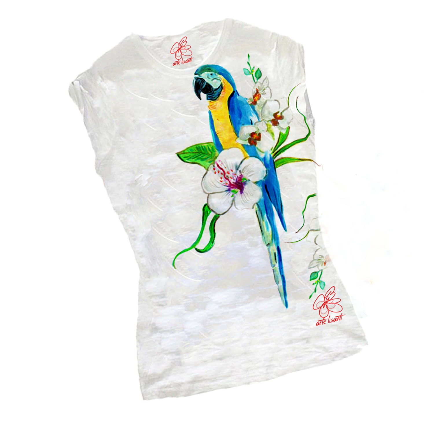 T-shirt dipinta a mano – Blue parrot: Tropical effect con fiori tropicali e un colorato ed esotico pappagallo.