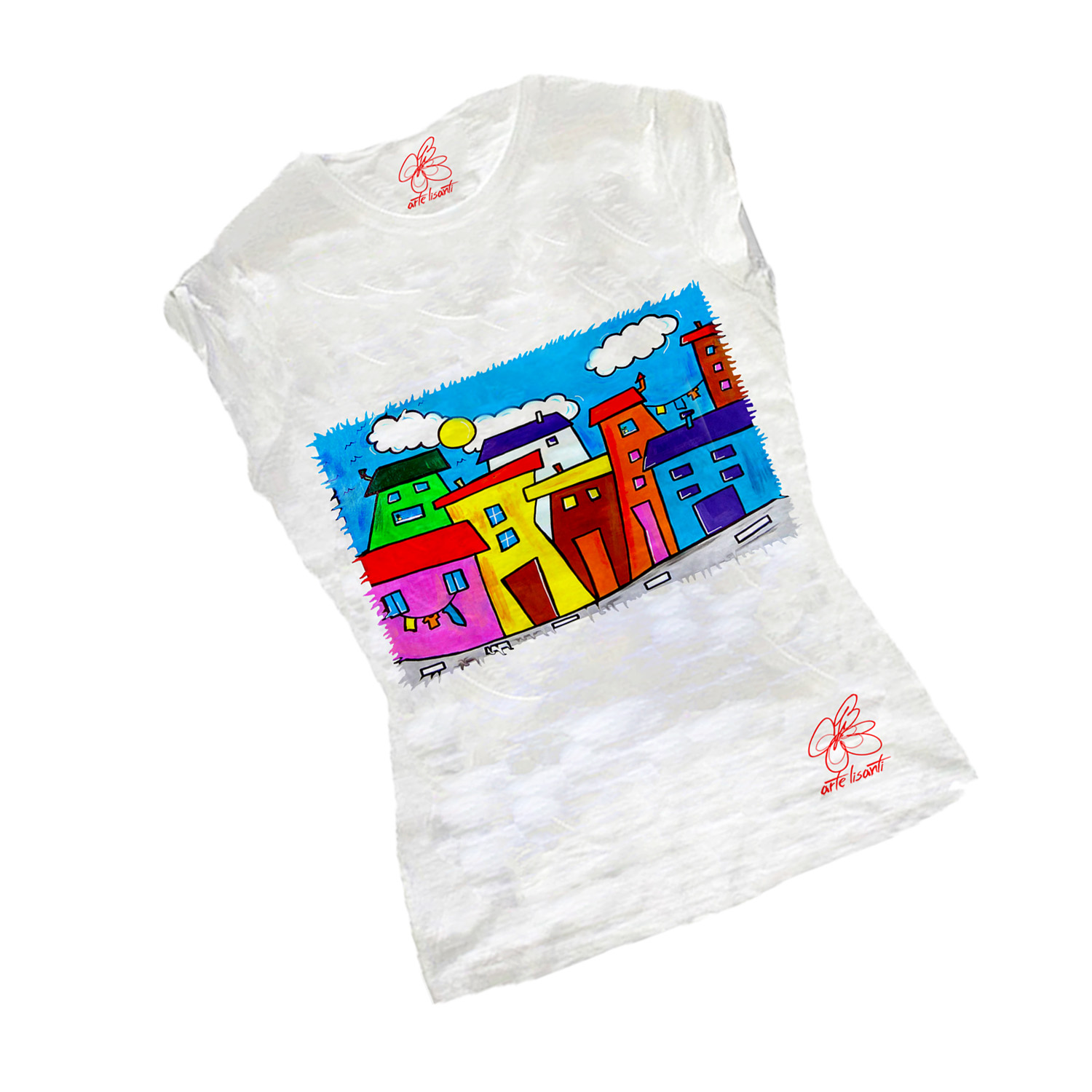 T-shirt dipinta a mano – Cartoon city day: Un paesaggio dai tratti fumetto con le sue case inclinate, la strada che l’attraversa, i vasi di fiori alle finestre e i panni stesi; il sole splende e le rondini volano in lontananza, è una città magica quella di Cartoon City Day, che potrà colorare un outfit sportivo ma anche sorprendere in un look minimal.