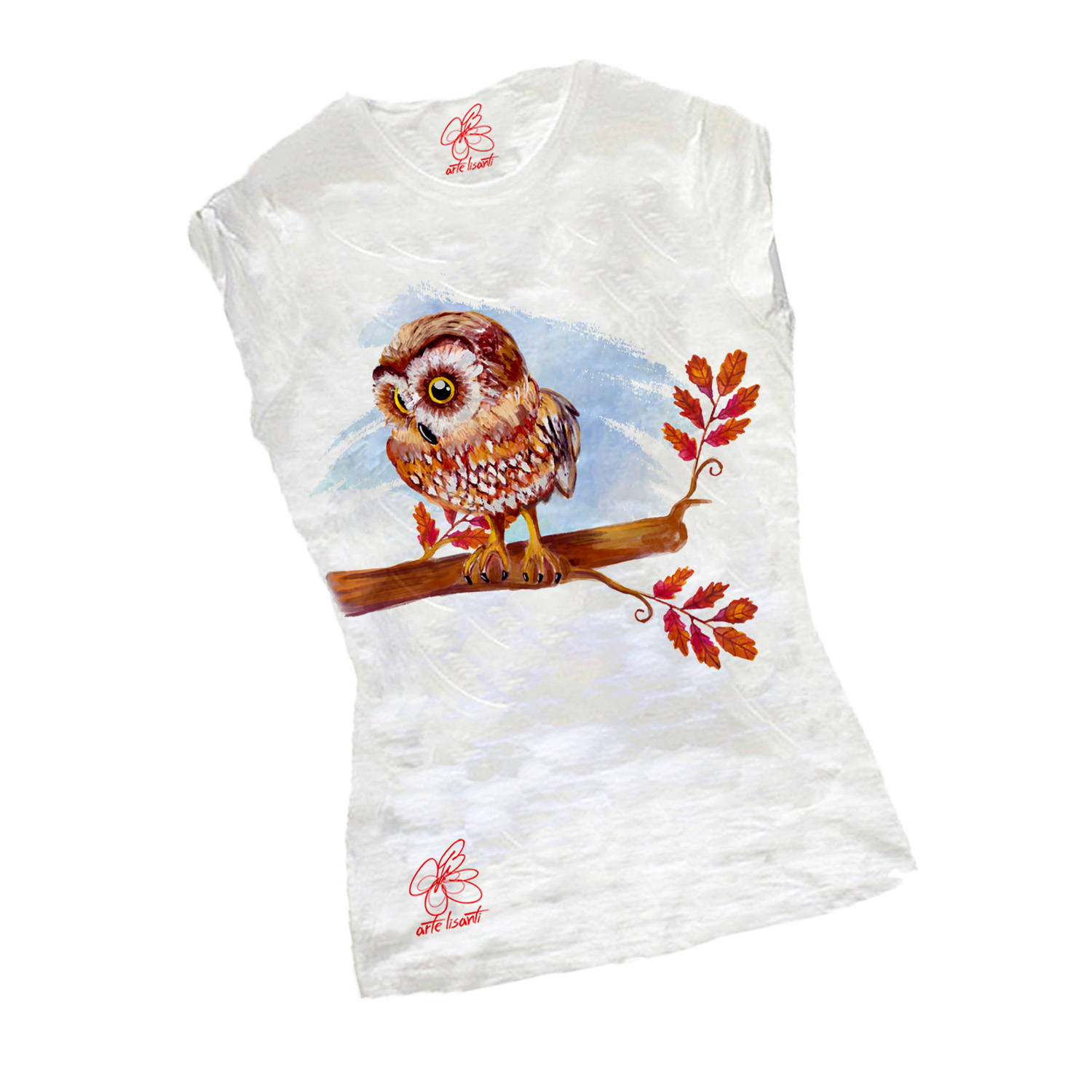 T-shirt dipinta a mano – Civetta : Una dolce civetta con i suoi occhioni grandi da indossare.