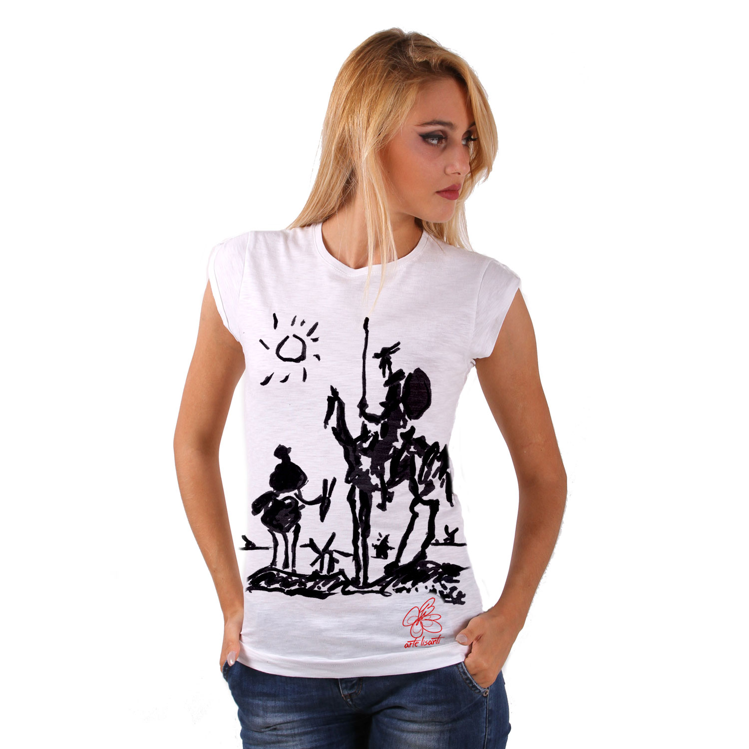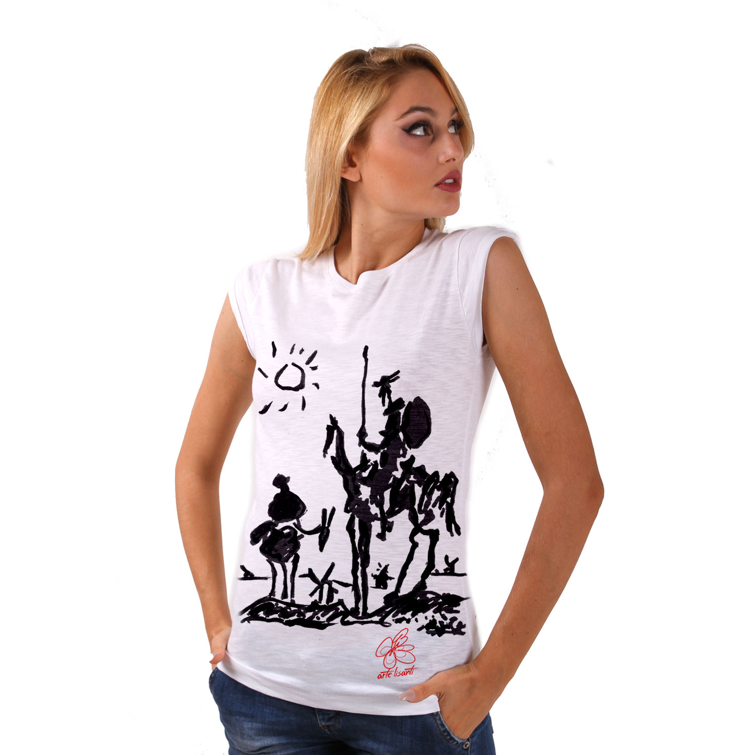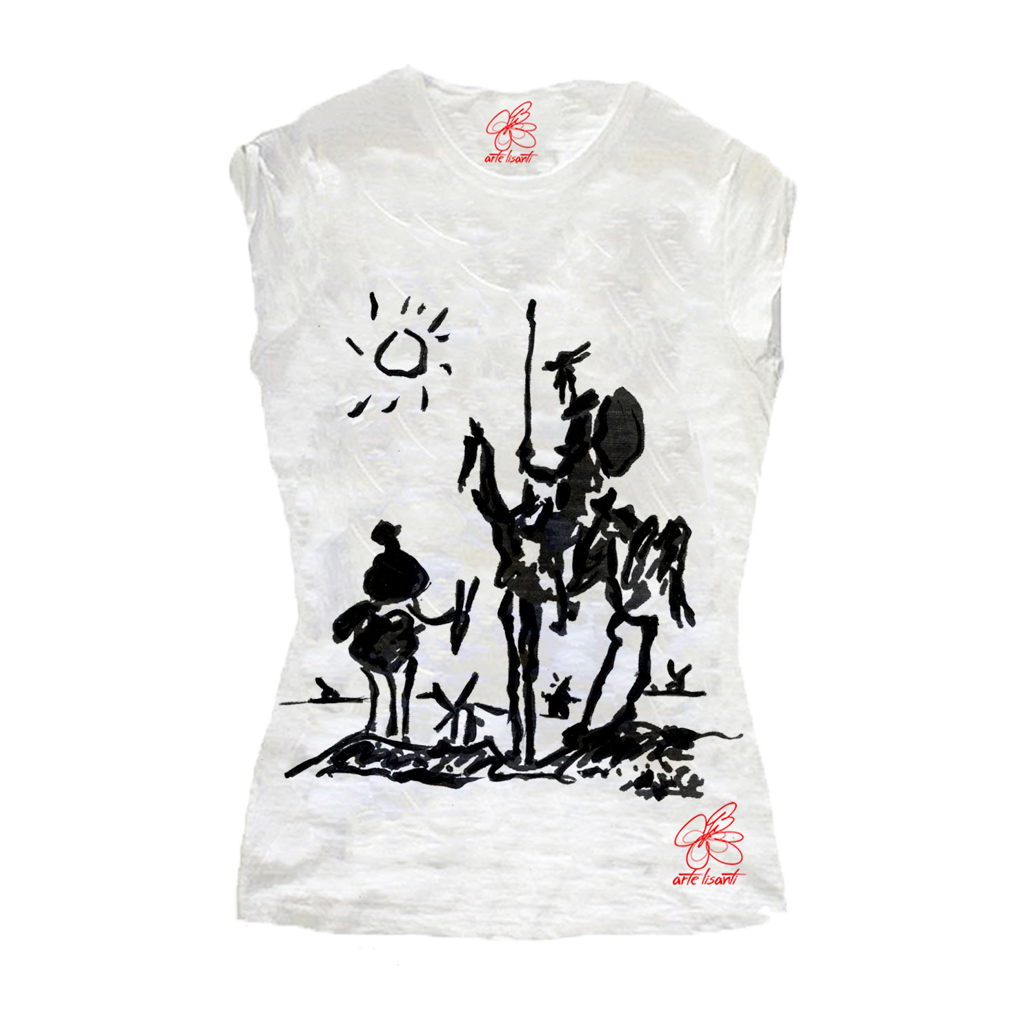 T-shirt dipinta a mano – Don Chisciotte della Mancia di Picasso: Grandi pennellate per questo delizioso accessorio che ritrae il Don Chisciotte della Mancia del celebre Pablo Picasso. Per non passare inosservate!rima metà del ‘900.