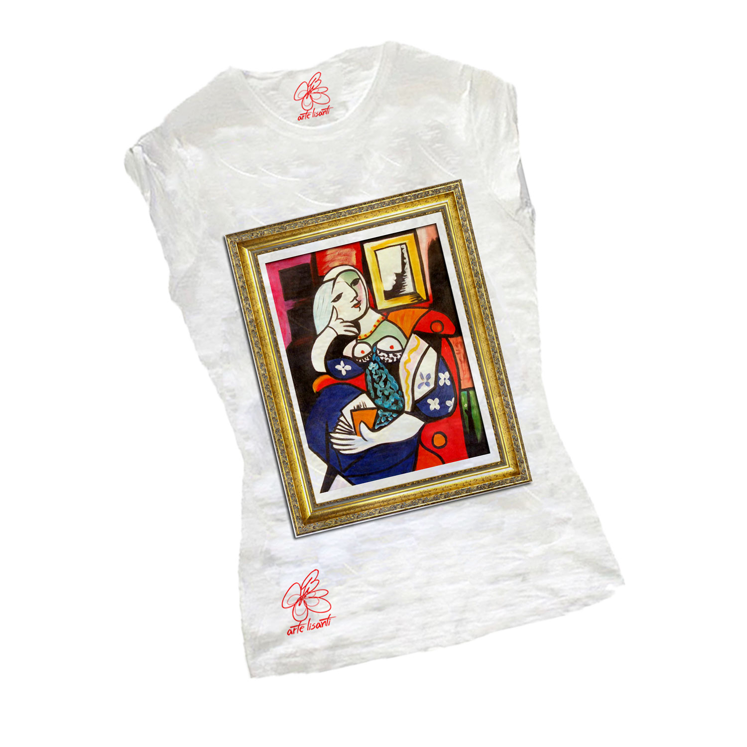 T-shirt dipinta a mano – Donna che legge di Picasso : Una grande opera del maestro indiscusso del cubismo colora un meravigliosa maglietta dai tratti decisi e colori sgargianti.