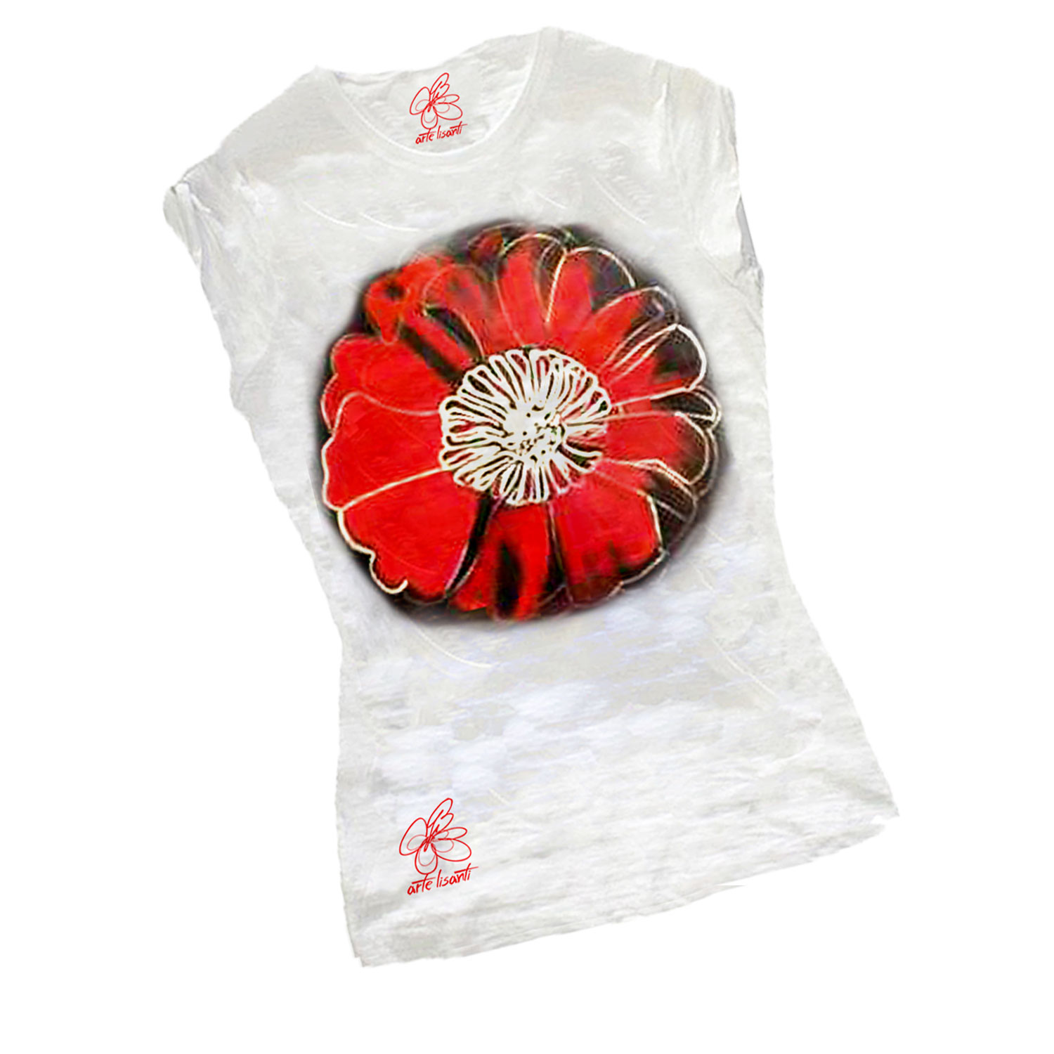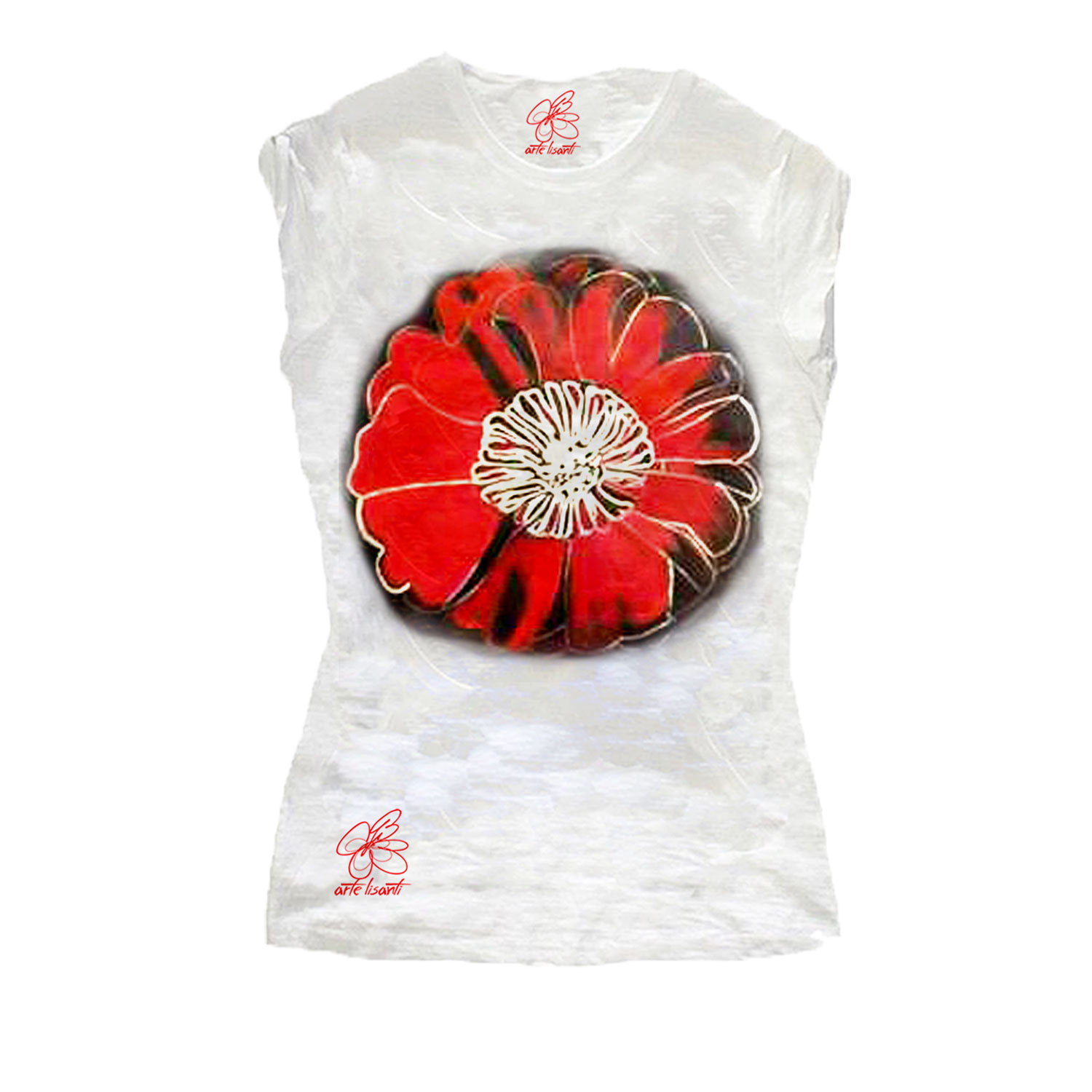 Maglietta dipinta a mano – Flowers di Warhol: Omaggio al re della Pop Art; ArteLisanti sceglie la versione flowers rosso passione per decorare questa splendida t-shirt.