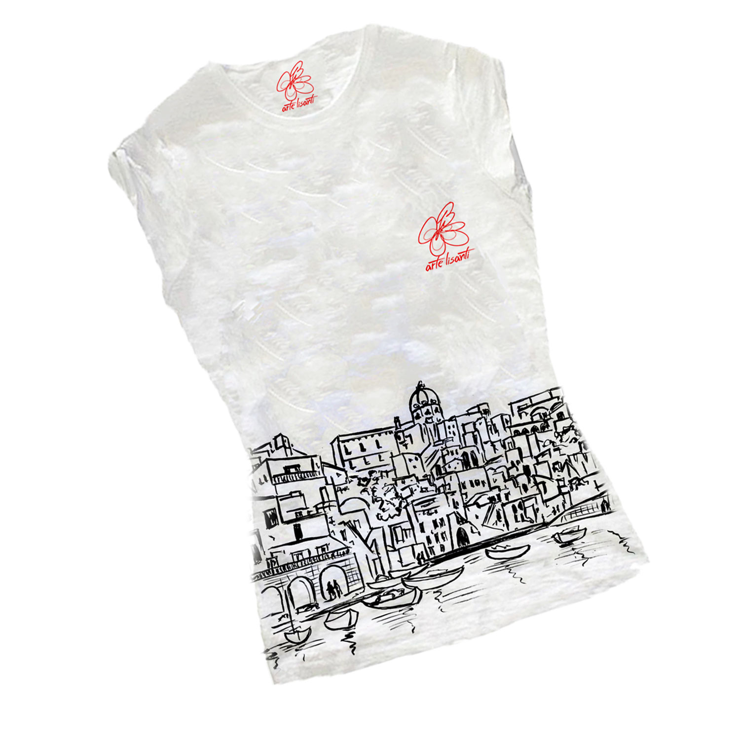 T-shirt girocollo manica corta 100% cotone preristretto in filo di cotone slub (fiammato) Bordo stretto a costine sul girocollo Maniche corte raccolte sulle spalle, Cuciture laterali, Cucitura decorativa sulla base Stampa di ottima qualità ottenuta da grafica dipinta a mano Rifiniture a pennello dipinte a mano con colori brillanti Peso: 150 g/m2
