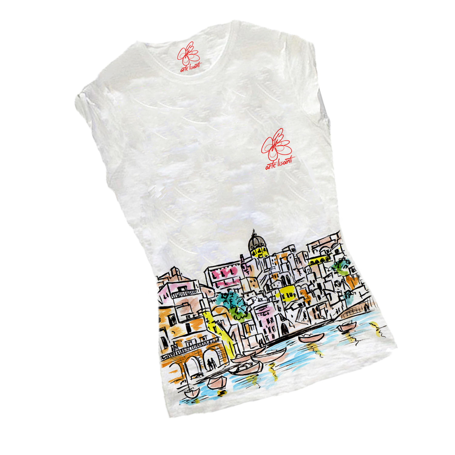 T-shirt dipinta a mano – I love Procida: Mare cristallino e un elegante borgo colorato, tante casette collegate da caratteristiche scale rendono questa piccola isola un gioiello di qui la nostra bella Italia può vantarsi.
