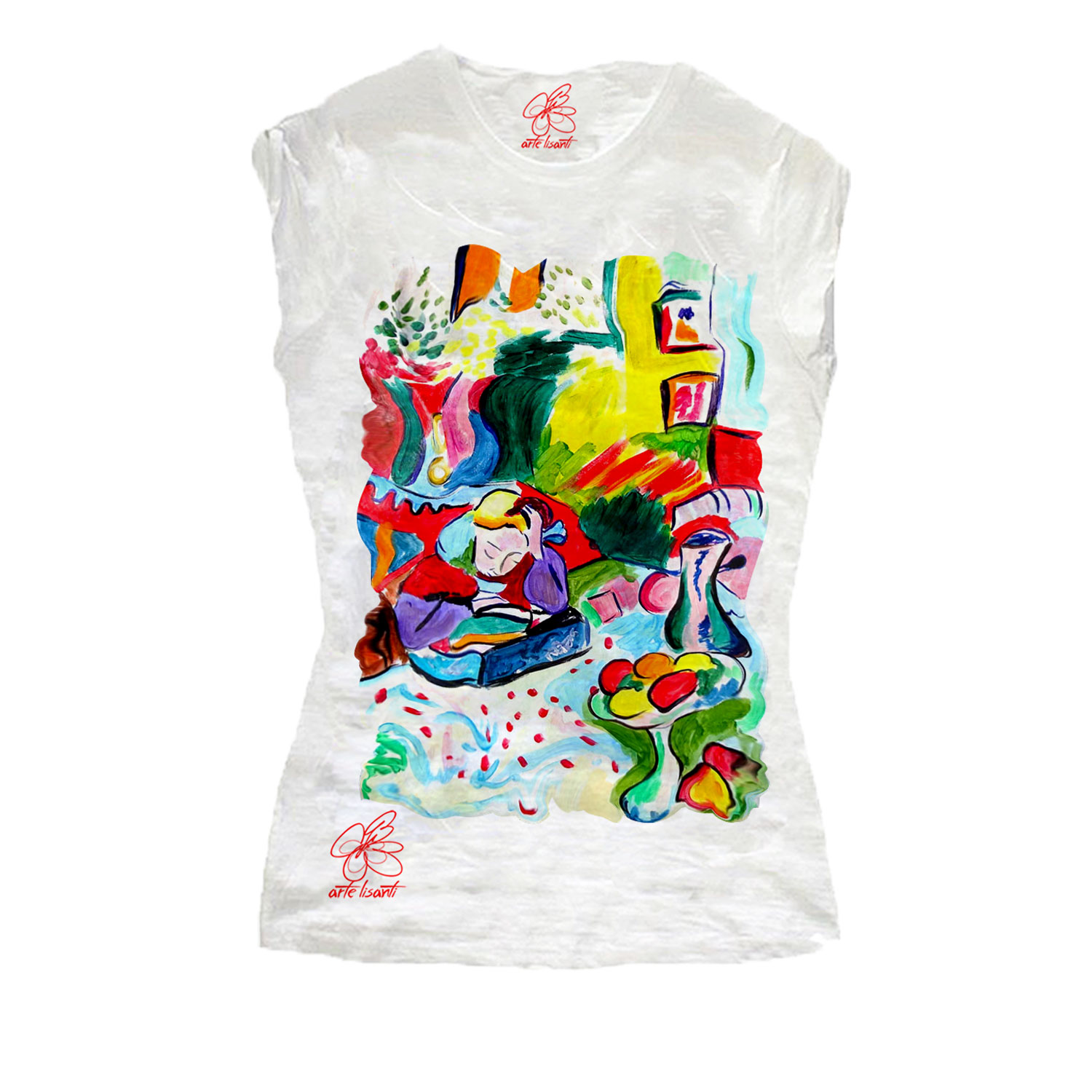 T-shirt dipinta a mano – Interno con ragazza che legge di Matisse: Una scena che dona quiete, sogno e curiosità, la lettura secondo Matisse impreziosita da colori brillanti, fantastici dettagli anche in rilievo.