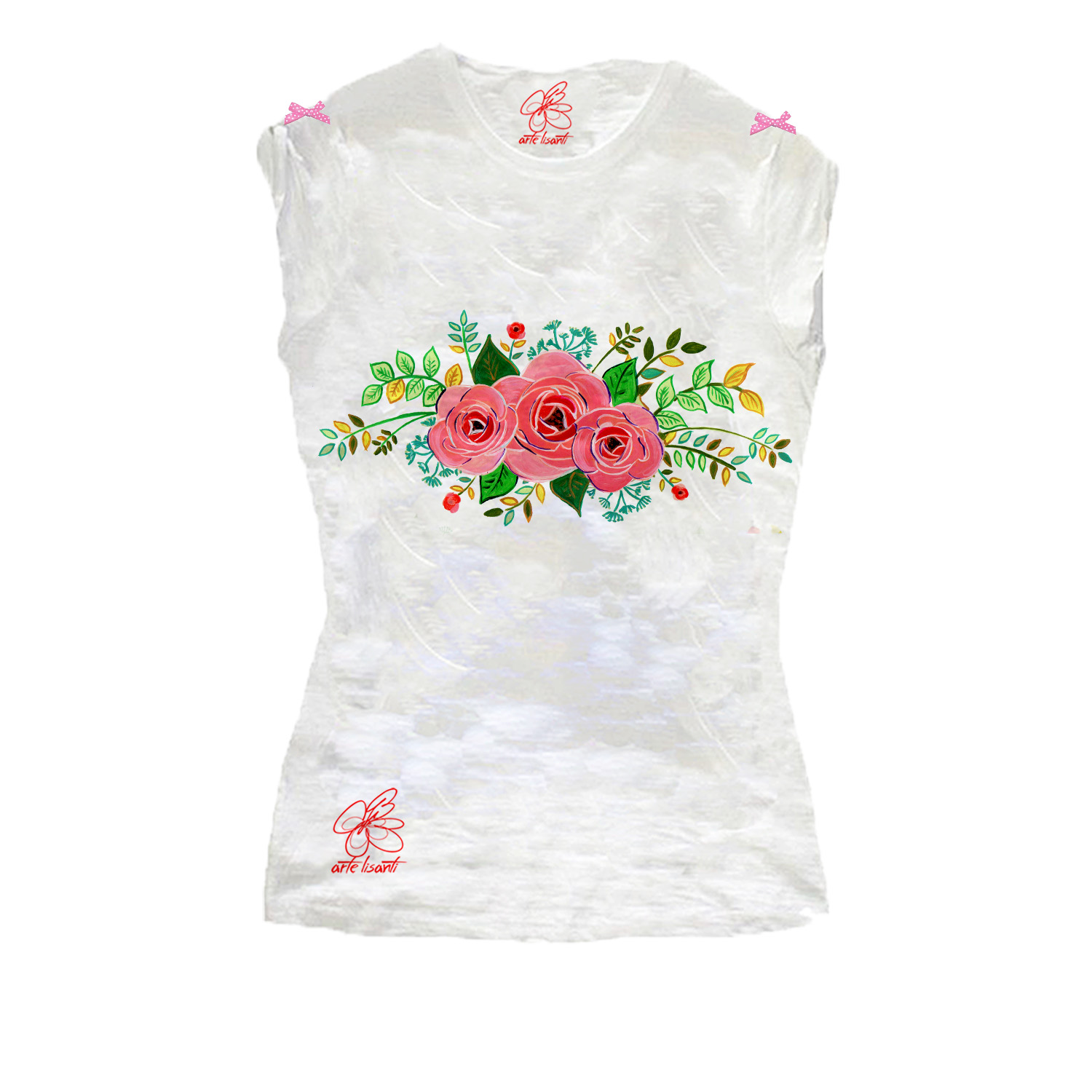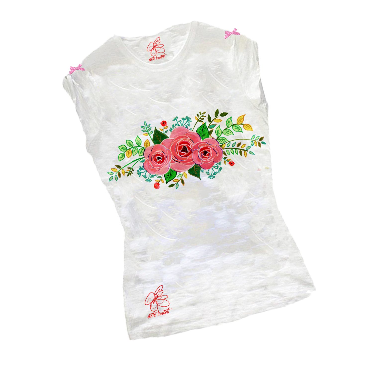 T-shirt dipinta a mano – Le chic: Eleganti roselline e fantastici dettagli in rilievo. Fiocchetti in stoffa applicati sulle maniche