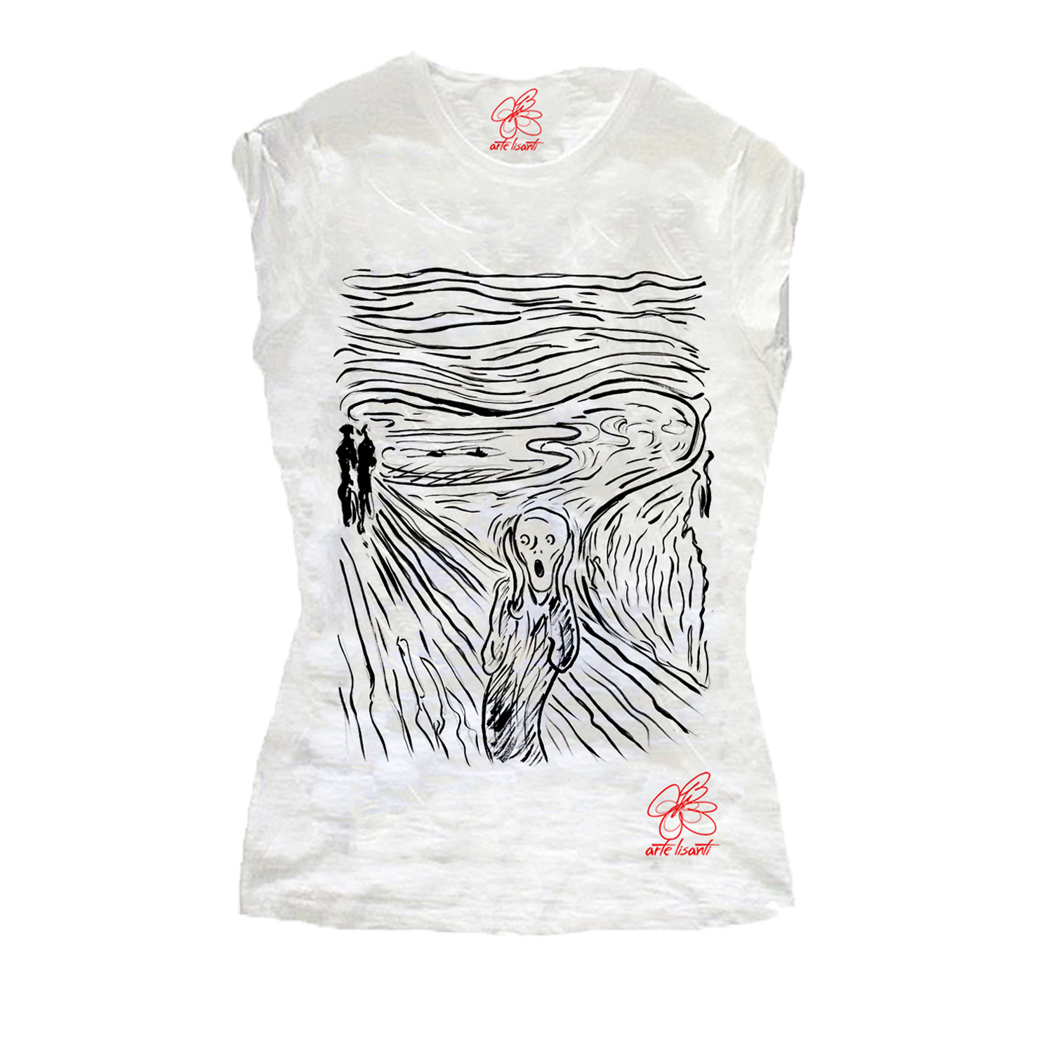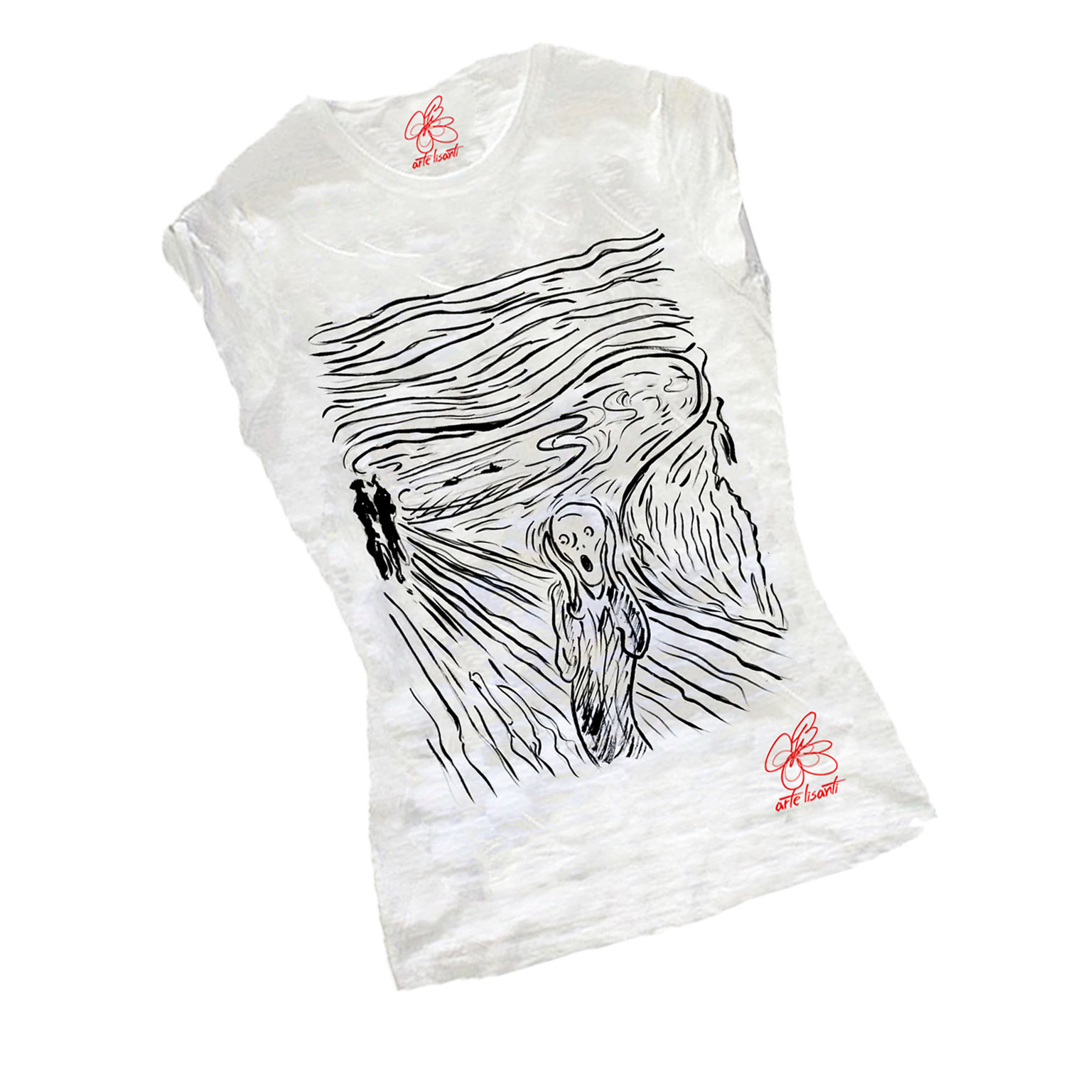Maglietta dipinta a mano – L’urlo di Munch cartoon black and white: anche conosciuto come “Il Grido” è uno dei quadri tra più famosi al mondo. Versione rivisitata in bianco e nero dai tratti cartoon e attuali.