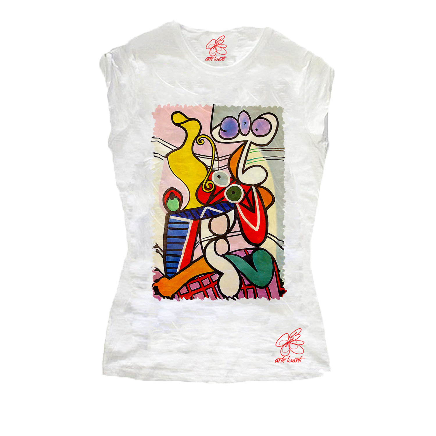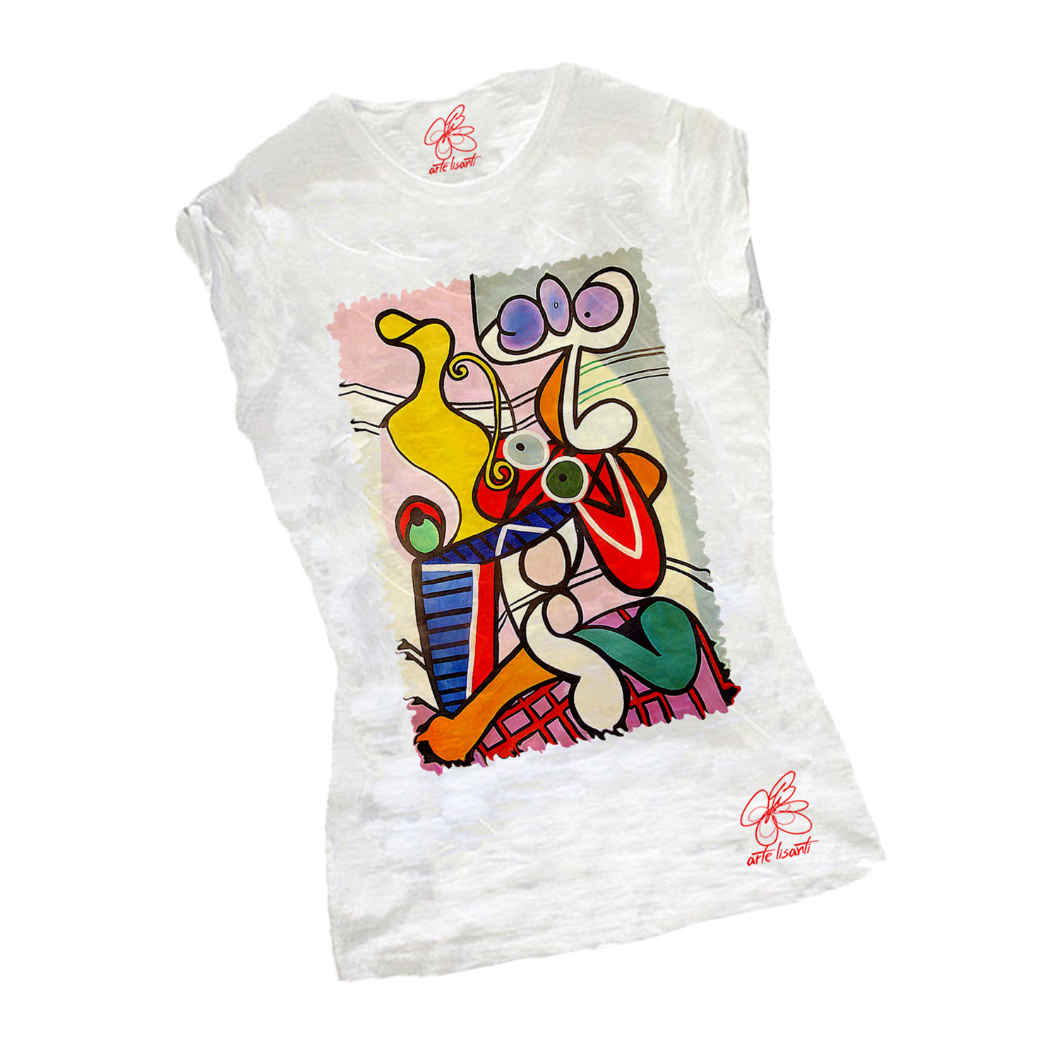 T-shirt dipinta a mano – Nudo con natura morta di Picasso: Questa composizione di Pablo Picasso grazie ai suoi colori accesi e le linee nere di contorno dona carattere a una fantastica t-shirt.