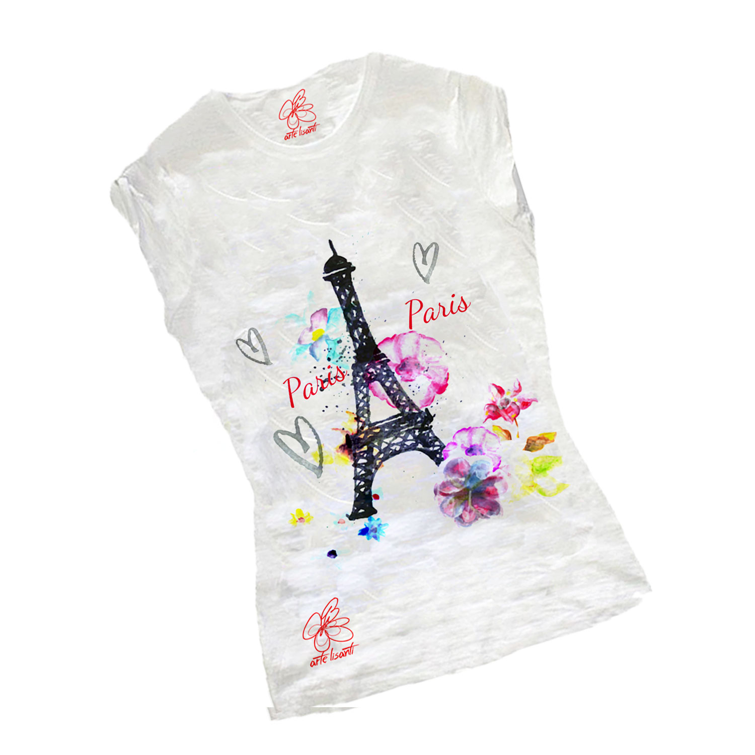 T-shirt dipinta a mano – Paris Paris: Si rende omaggio alla capitale Europea romantica per eccellenza, con tratti dolci e coloratissime pennellate. Dettagli in rilievo!