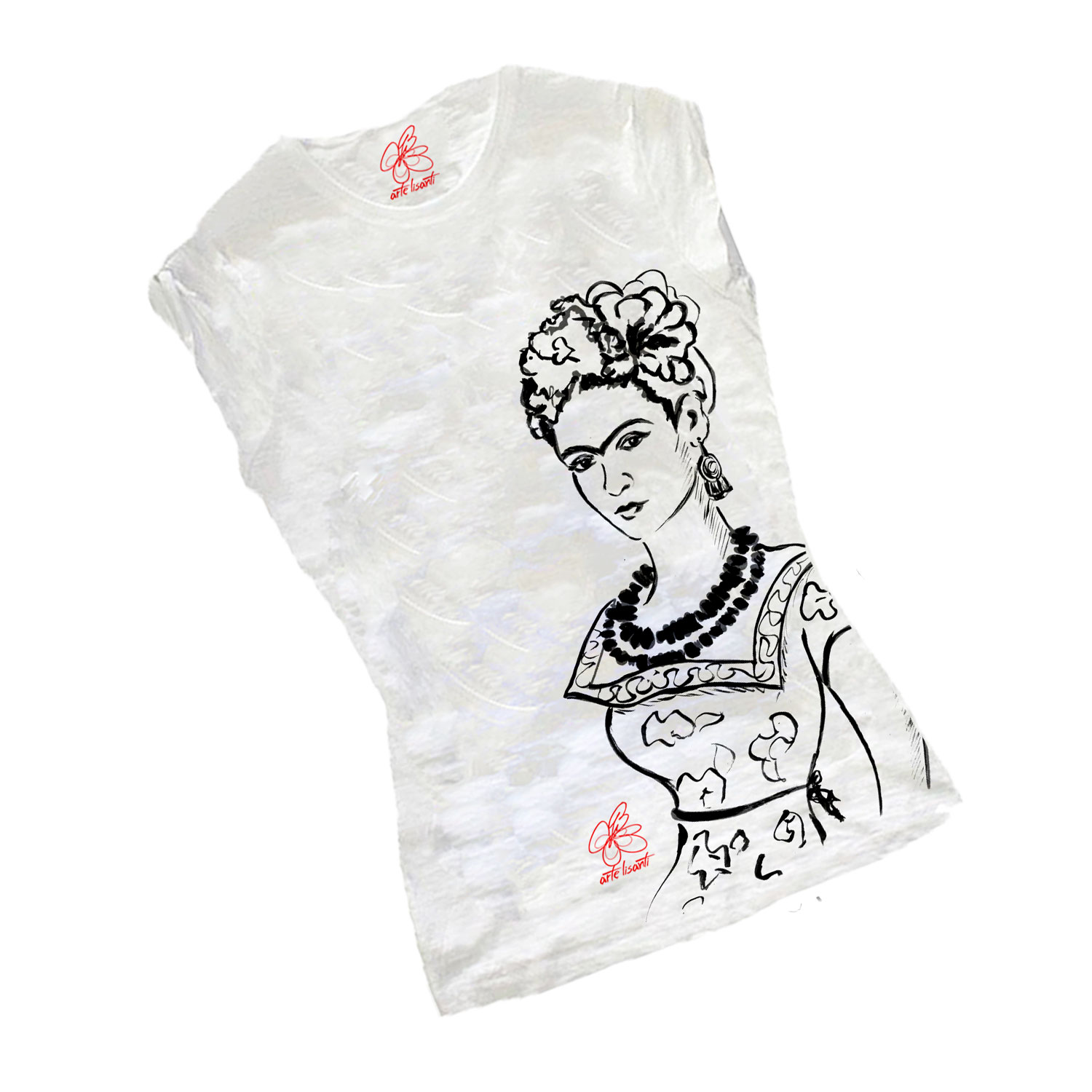 T-shirt dipinta a mano – Passione per Frida black and white: Passionale, giocosa, curiosa, dai tratti cartoon in bianco e nero. Queste sono le caratteristiche di questa maglietta che omaggia Frida Kahlo, la famosa pittrice messicana vissuta nella prima metà del ‘900.