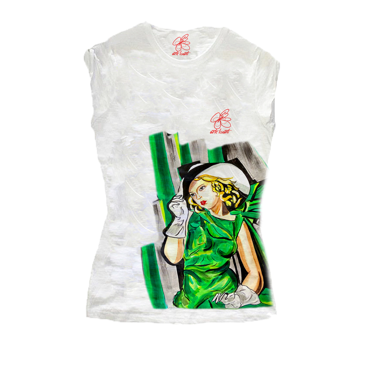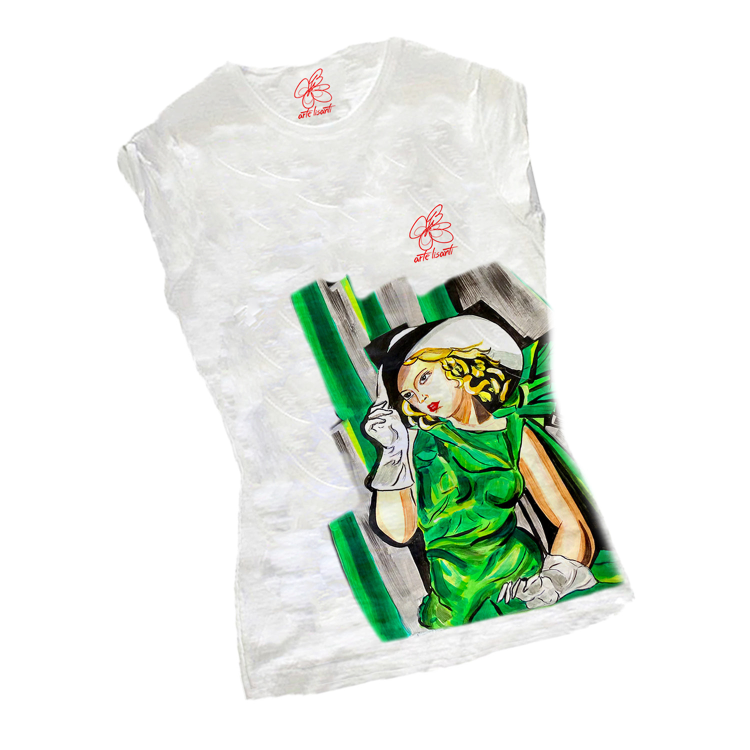 T-shirt dipinta a mano – Ragazza in verde di De Lempicka: Dipinto tra più seducenti della Baronessa dei pennelli. Elegante e sofisticata fanciulla fasciata da uno svolazzante abito verde. L’interpretazione ArteLisanti enfatizza lo stile di De Lempicka per una maglietta unica all’insegna dell’arte.