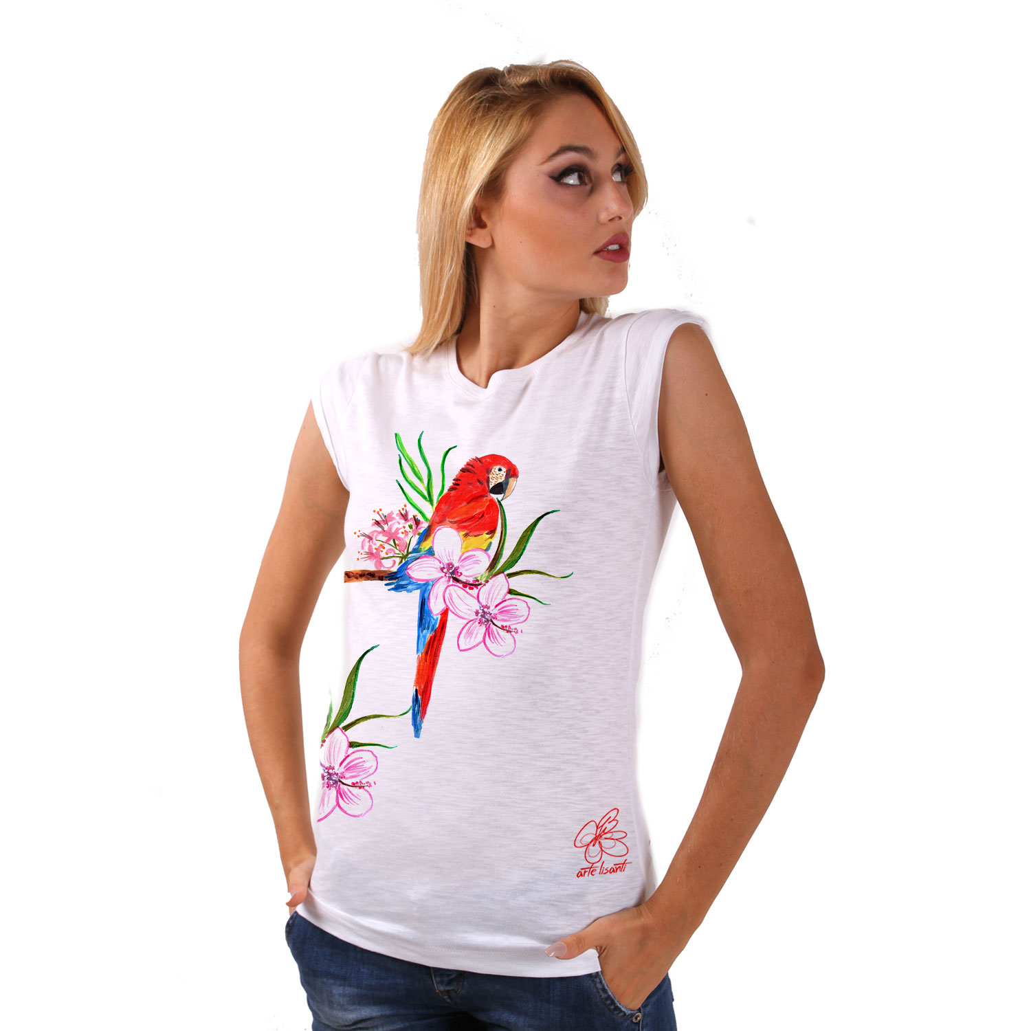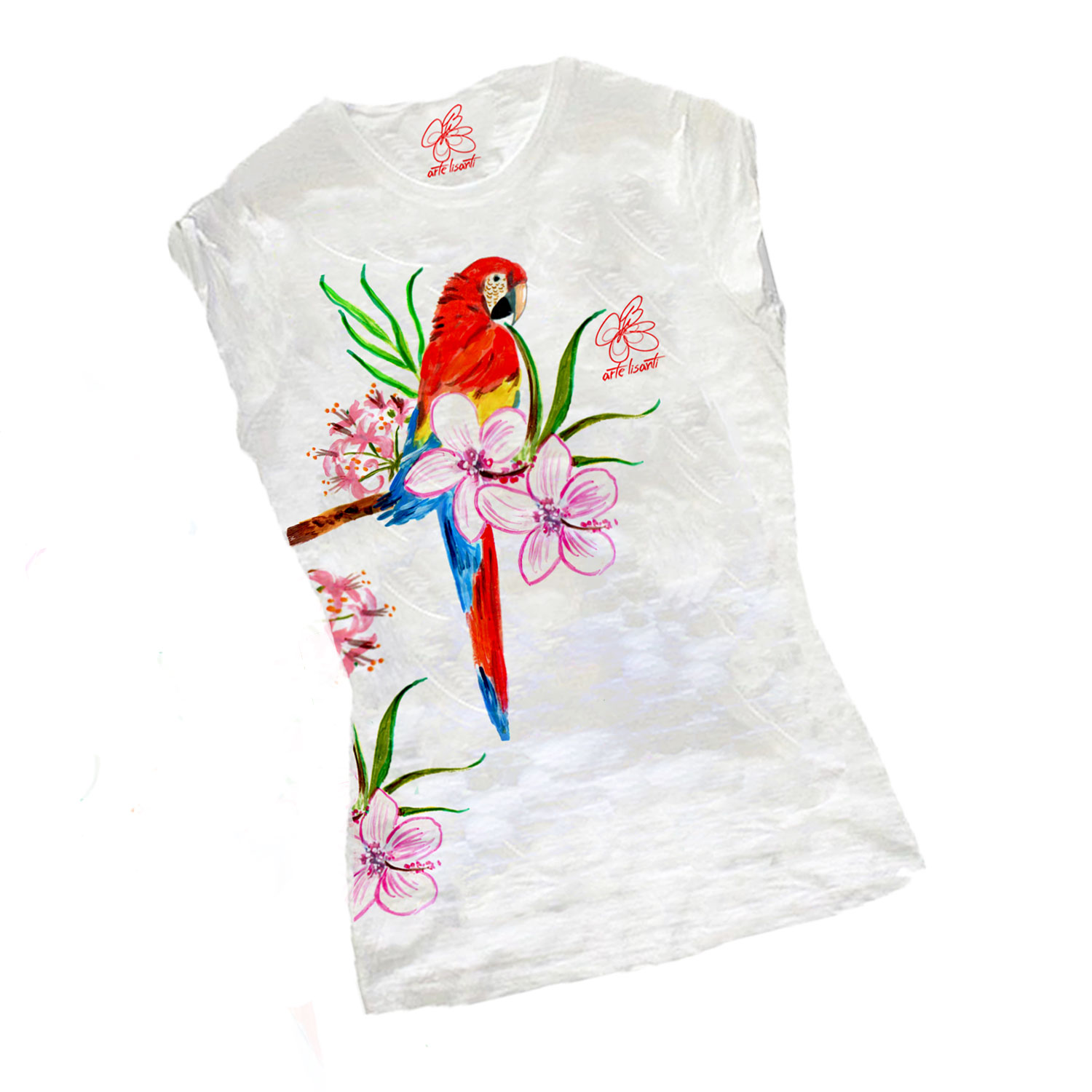 T-shirt dipinta a mano – Red parrot: Tropical effect con fiori tropicali e un colorato ed esotico pappagallo.
