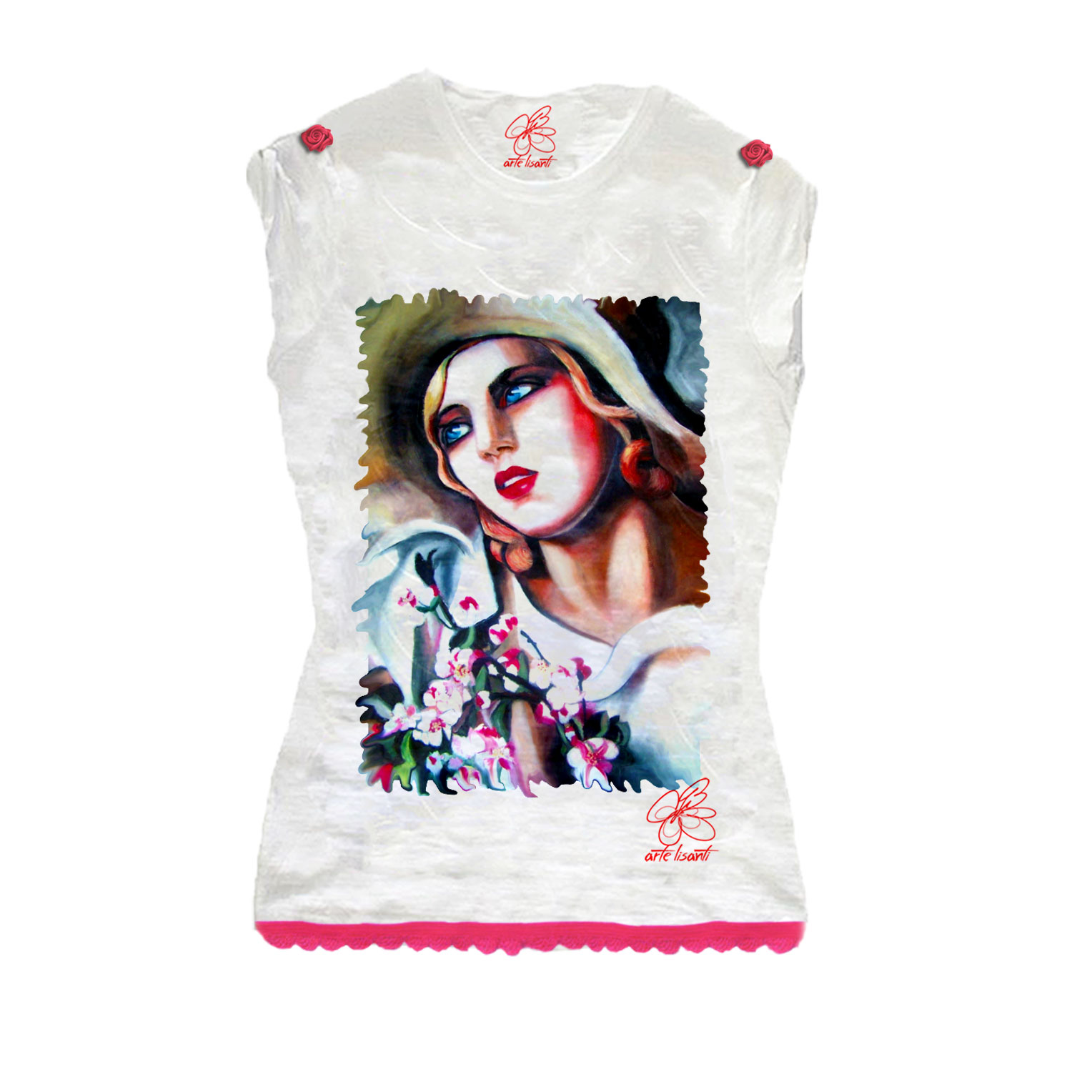 T-shirt dipinta a mano – Ritratto di giovane ragazza di De Lempicka: Arte Lisanti racconta De Lempicka con tratti decisi e colori brillanti.