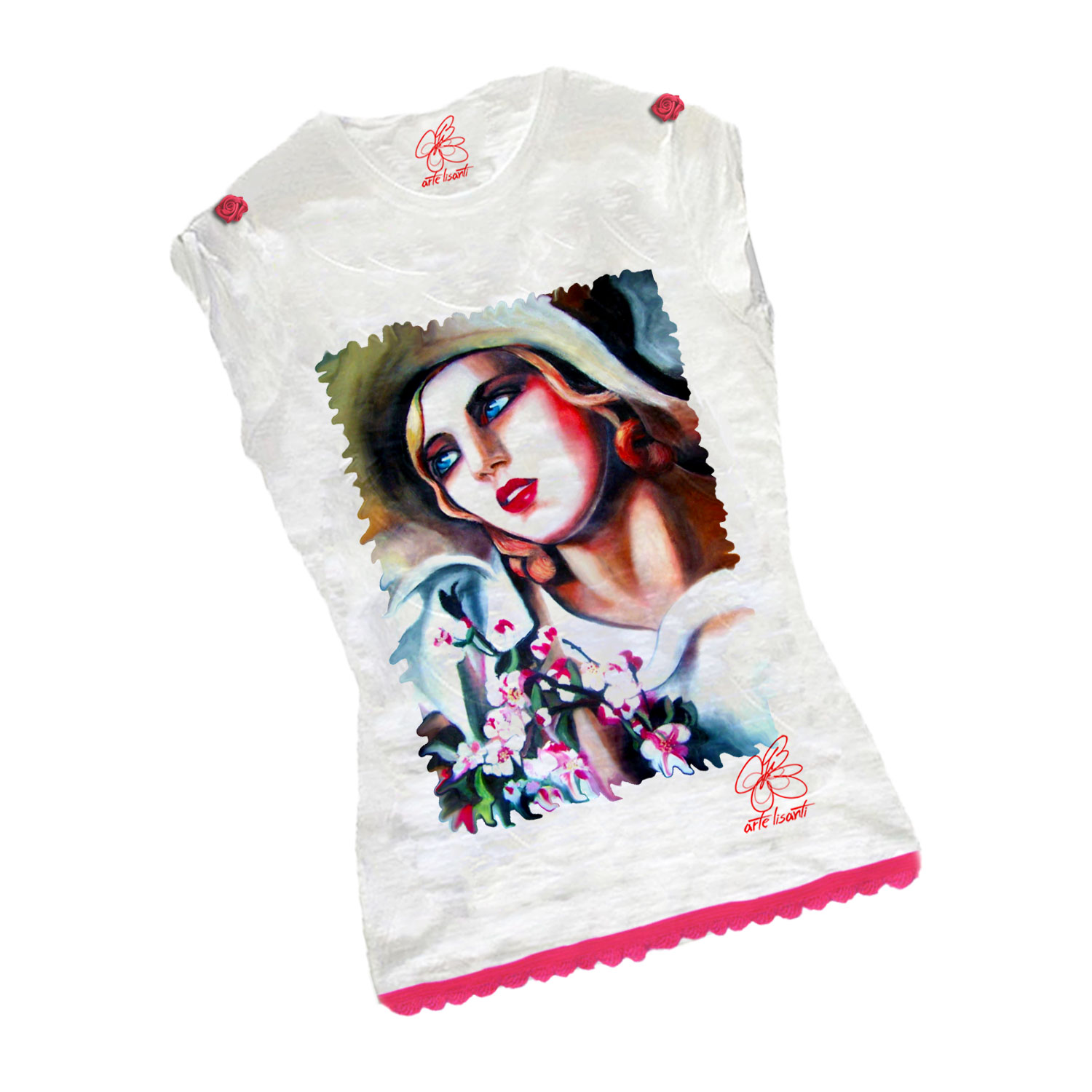 T-shirt girocollo manica corta 100% cotone preristretto in filo di cotone slub (fiammato) Bordo stretto a costine sul girocollo, decorazioni in stoffa rosa sul bordo e sulle maniche Maniche corte raccolte sulle spalle, Cuciture laterali, Cucitura decorativa sulla base Stampa di ottima qualità ottenuta da grafica dipinta a mano Rifiniture a pennello dipinte a mano con colori brillanti Peso: 150 g/m2