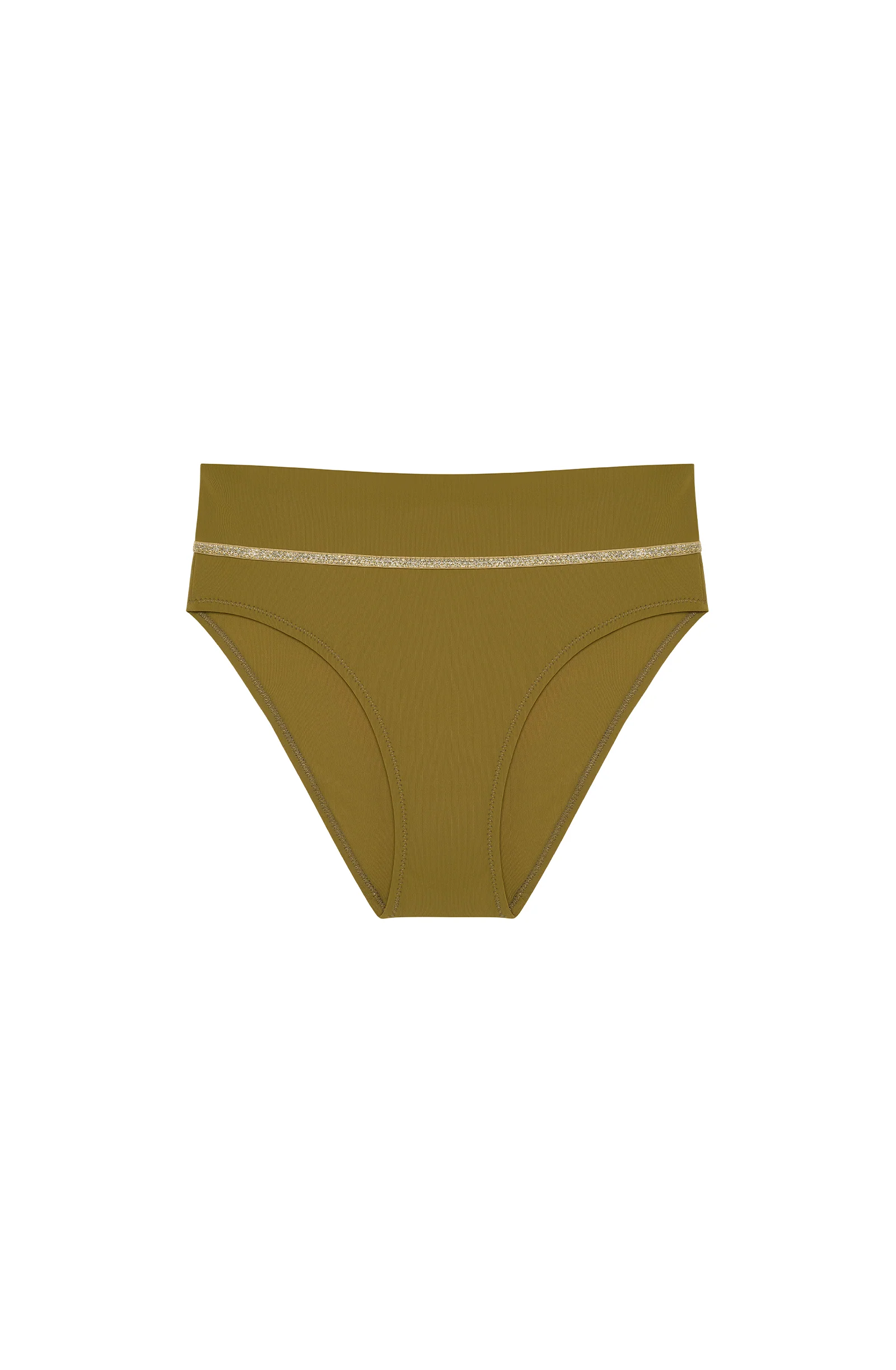 The TORIO bikini bottom offers comfort and adapts to every desire with its foldable high waist. This timeless, slightly retro style features an elegantly cut design. The golden lurex trim accentuates the waist and enhances the curves. Bronze, an authentic mineral shade, a blend of yellow and green.