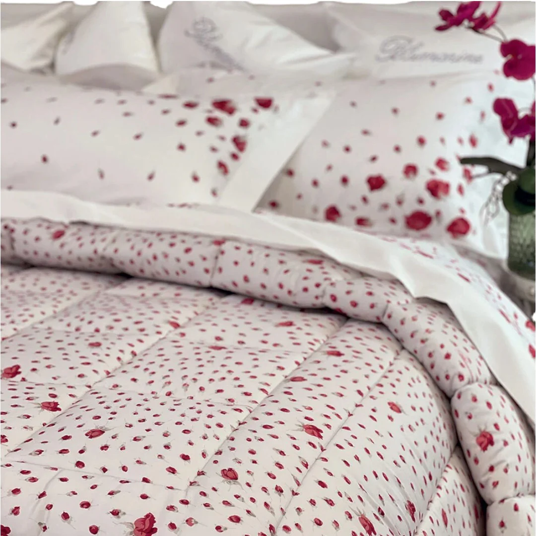 Scopri l’eleganza e la raffinatezza della trapunta matrimoniale Blumarine, impreziosita da una stampa all-over su pregiato raso di cotone 300 TC.