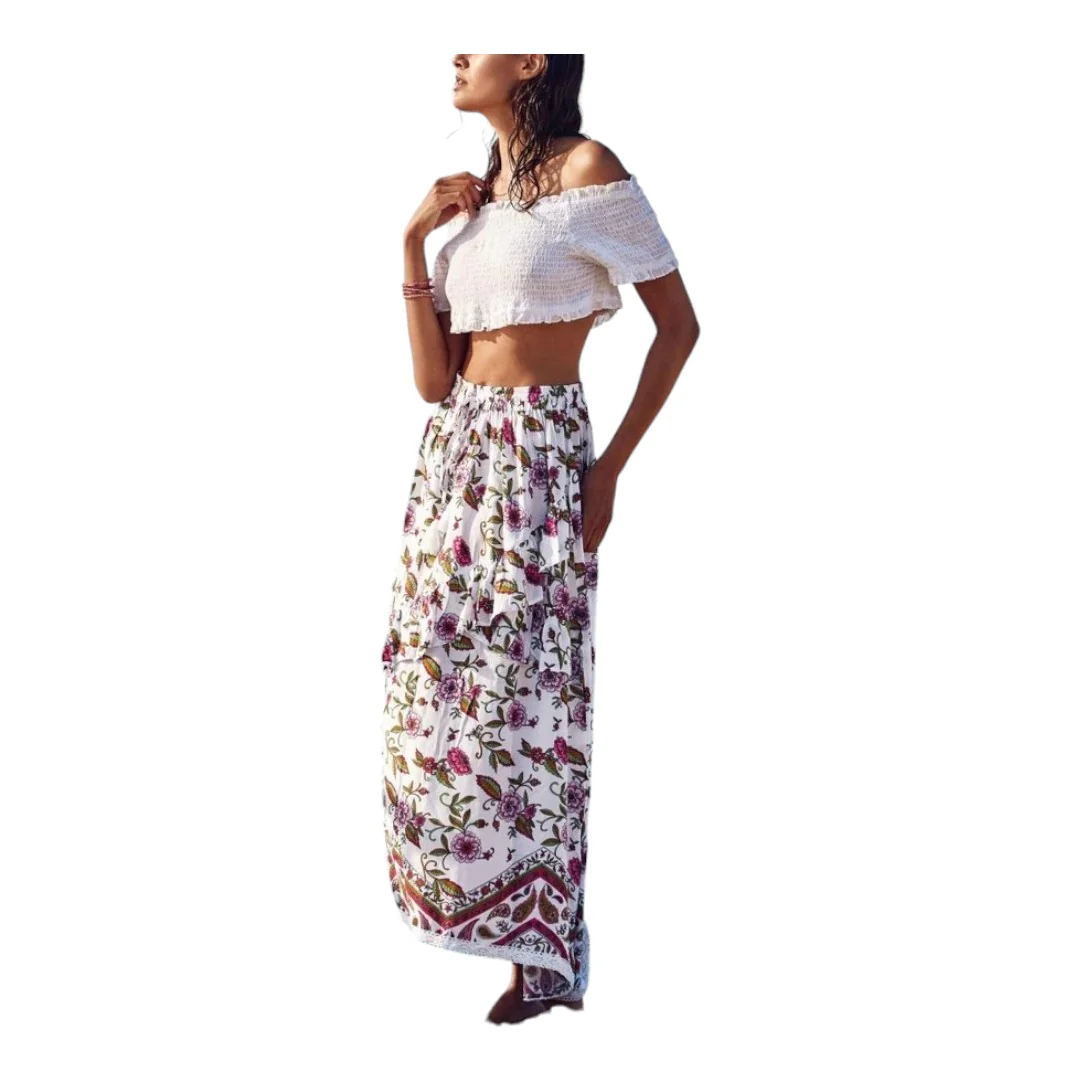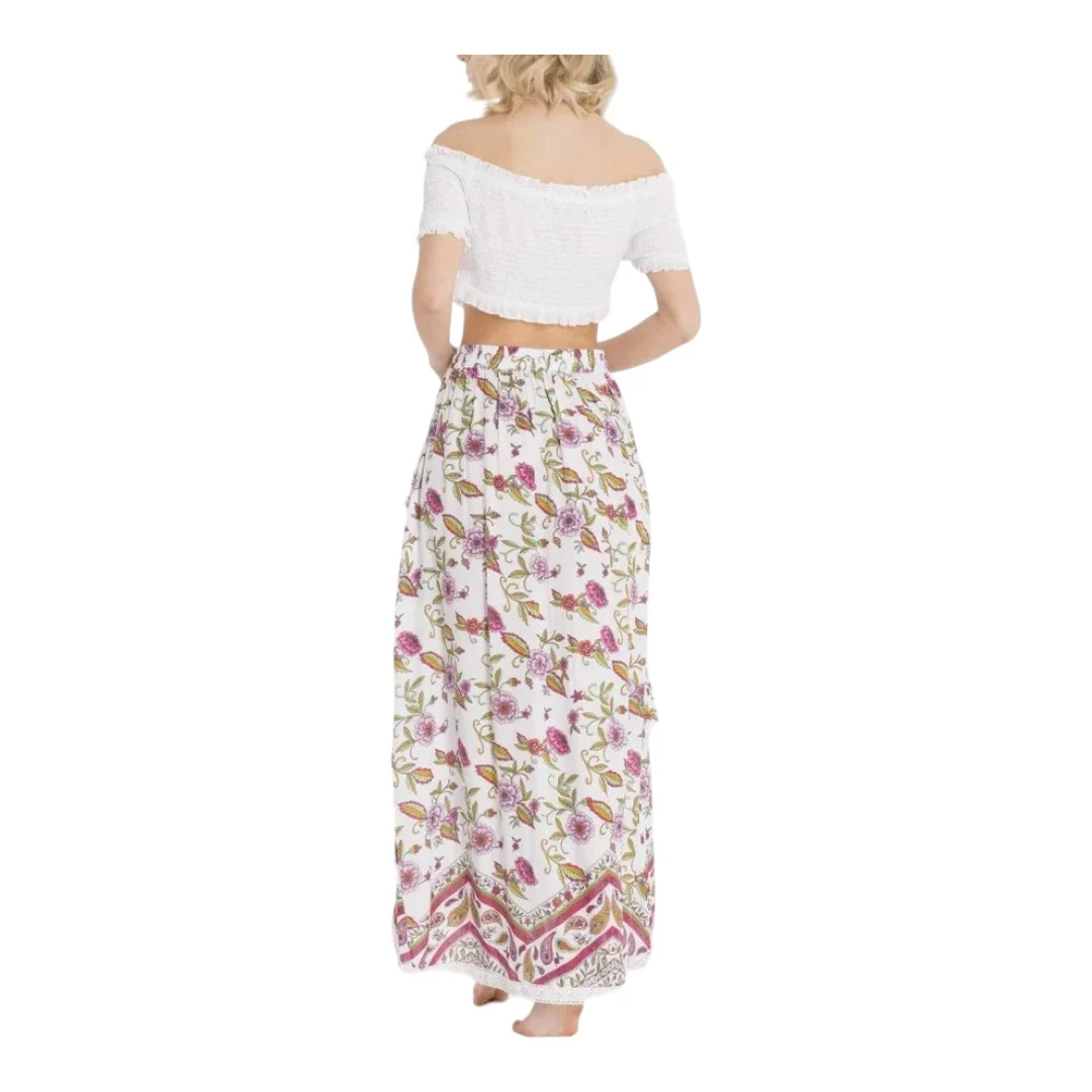 Gonna di Vacanze ItalianeModello lungoMotivo florealeCintura elasticavolant centraleDettaglio in pizzo sul fondoComposizione: 100% Viscosa