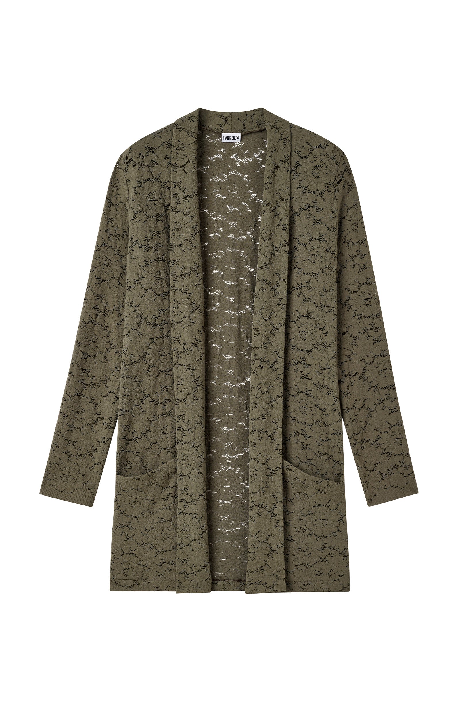 To face winter in a gentle way, the long French lace cardigan VAEA mixes both comfort and elegance. This loose cardigan, open at the front is adorned with a lined lace scarf collar giving a sophisticated flowing effect. Lichen green, an organic khaki green shade.