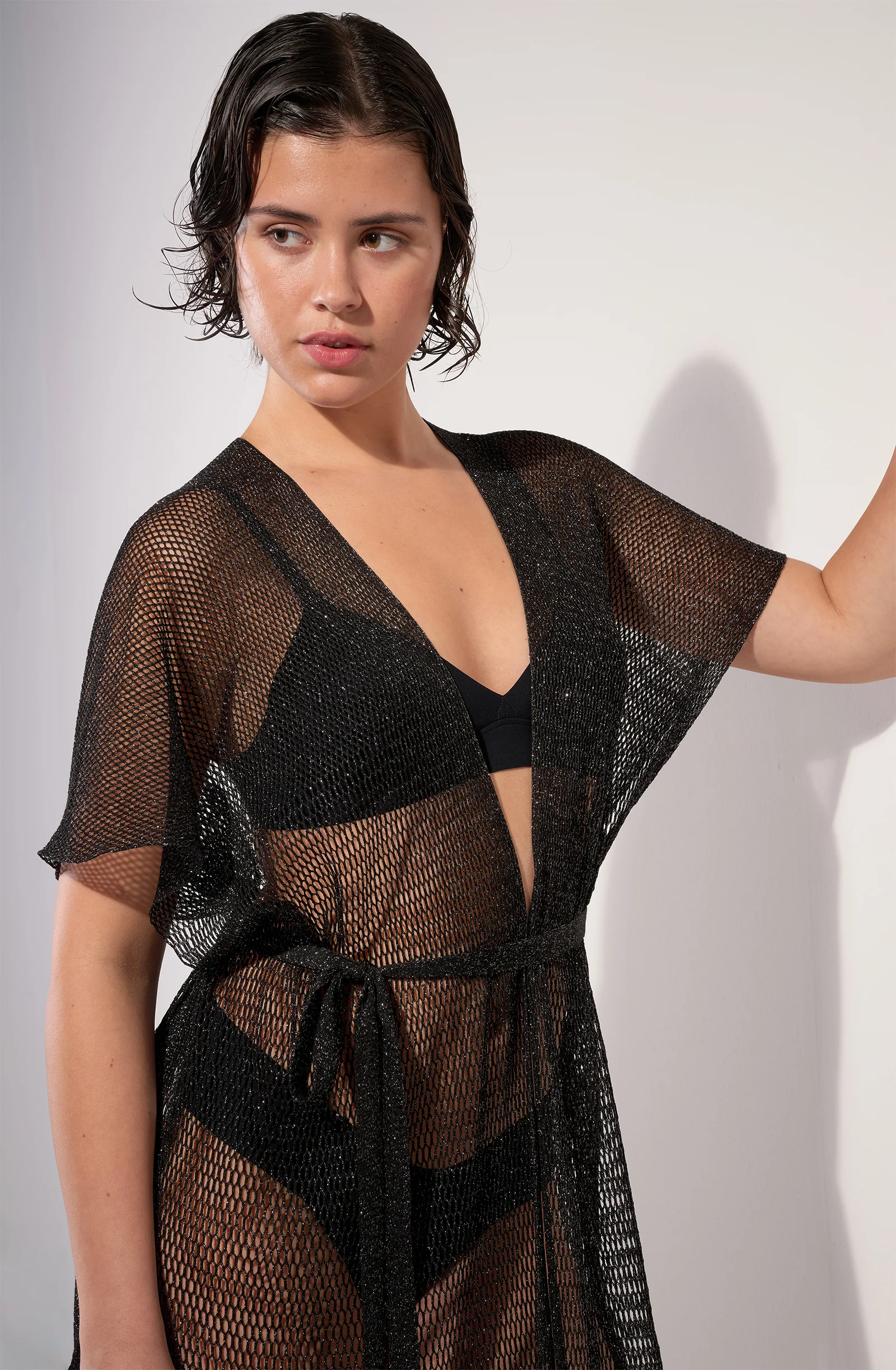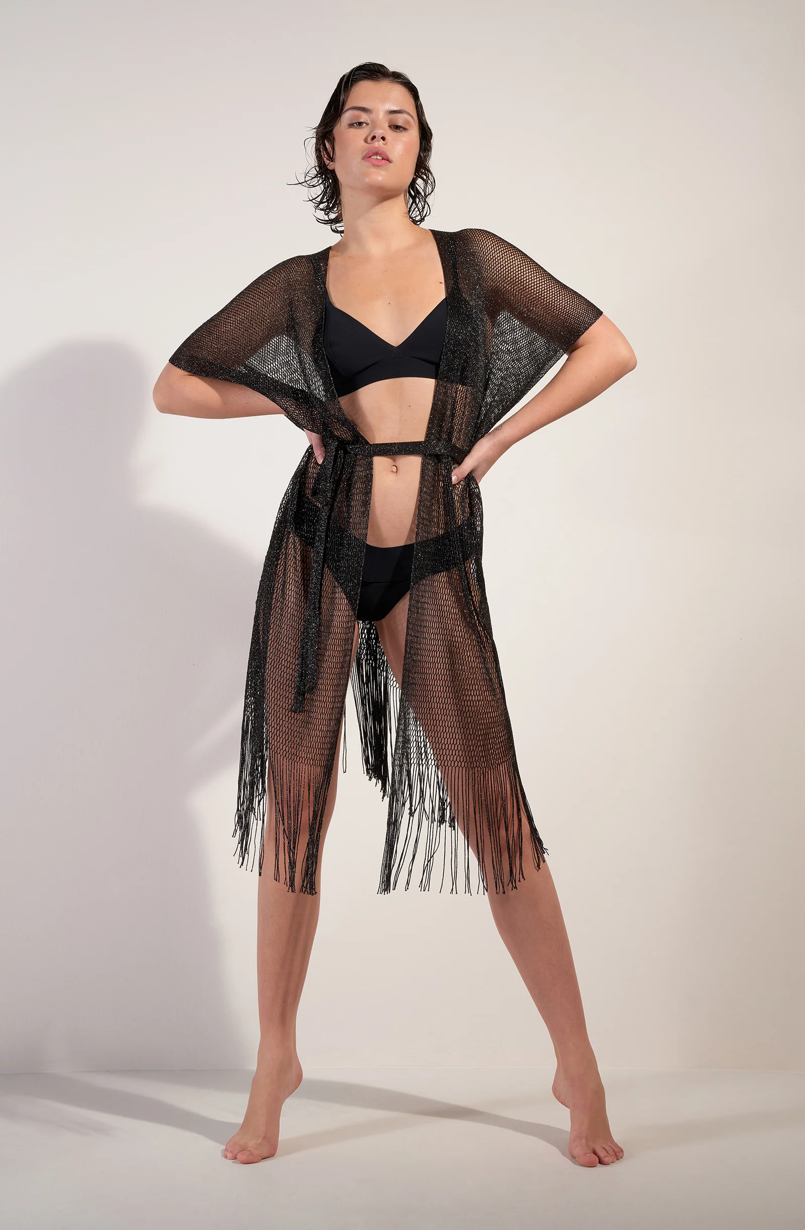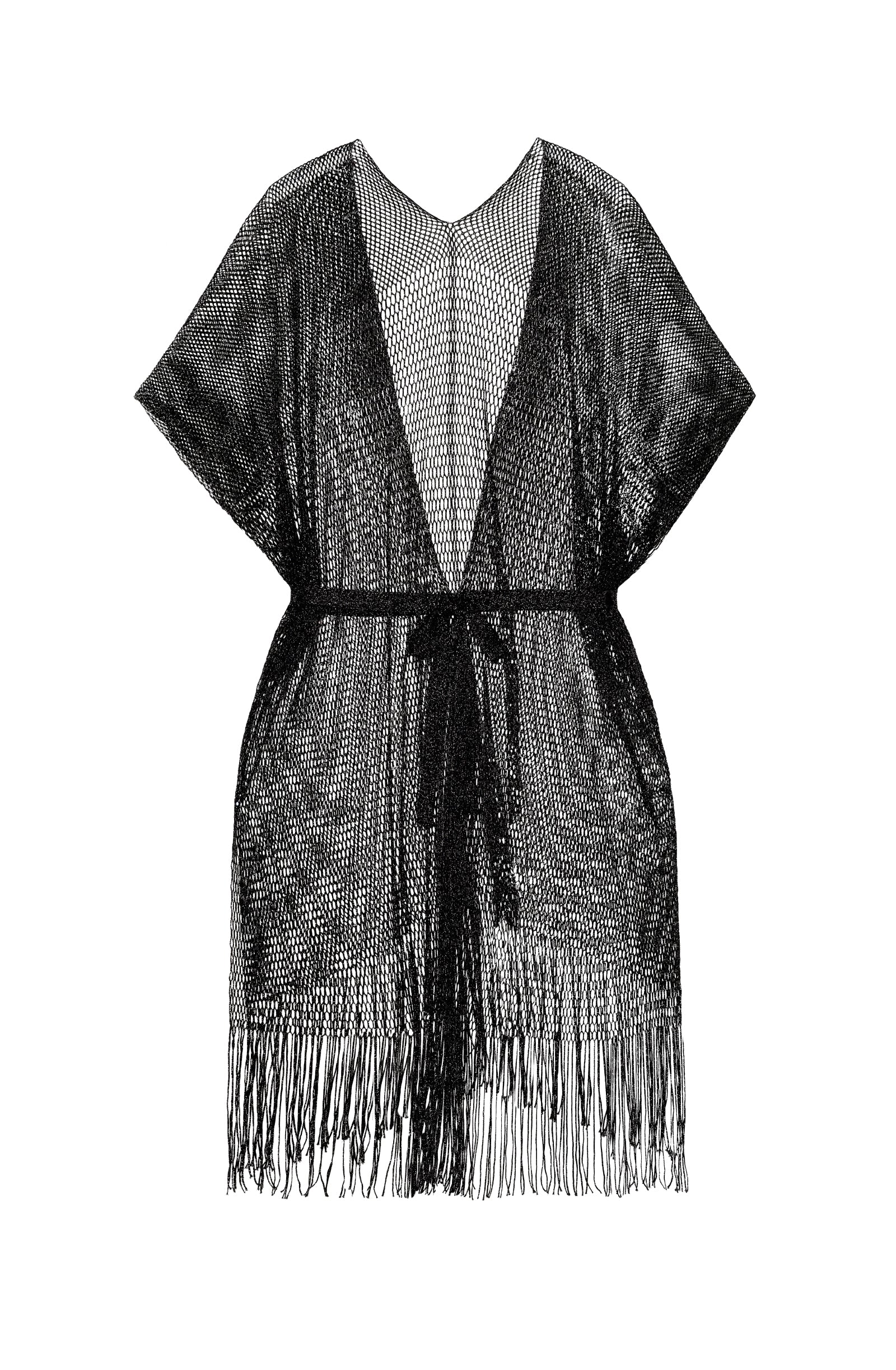 Fringed kimono jacket Shimmering mesh knit Thin removable belt Openwork belt loops on the sides at the back The model is 1m75 tall and wears size XS.