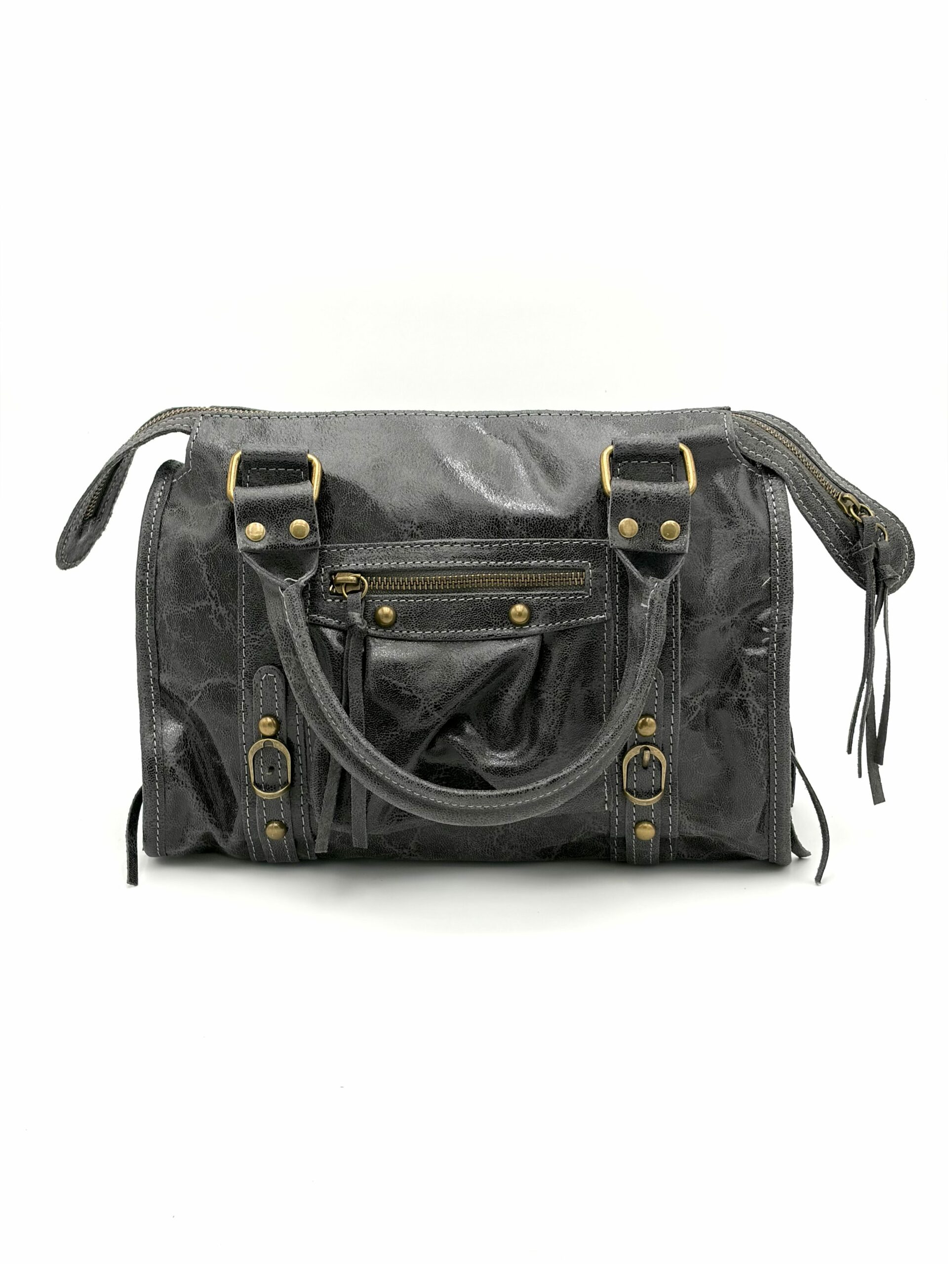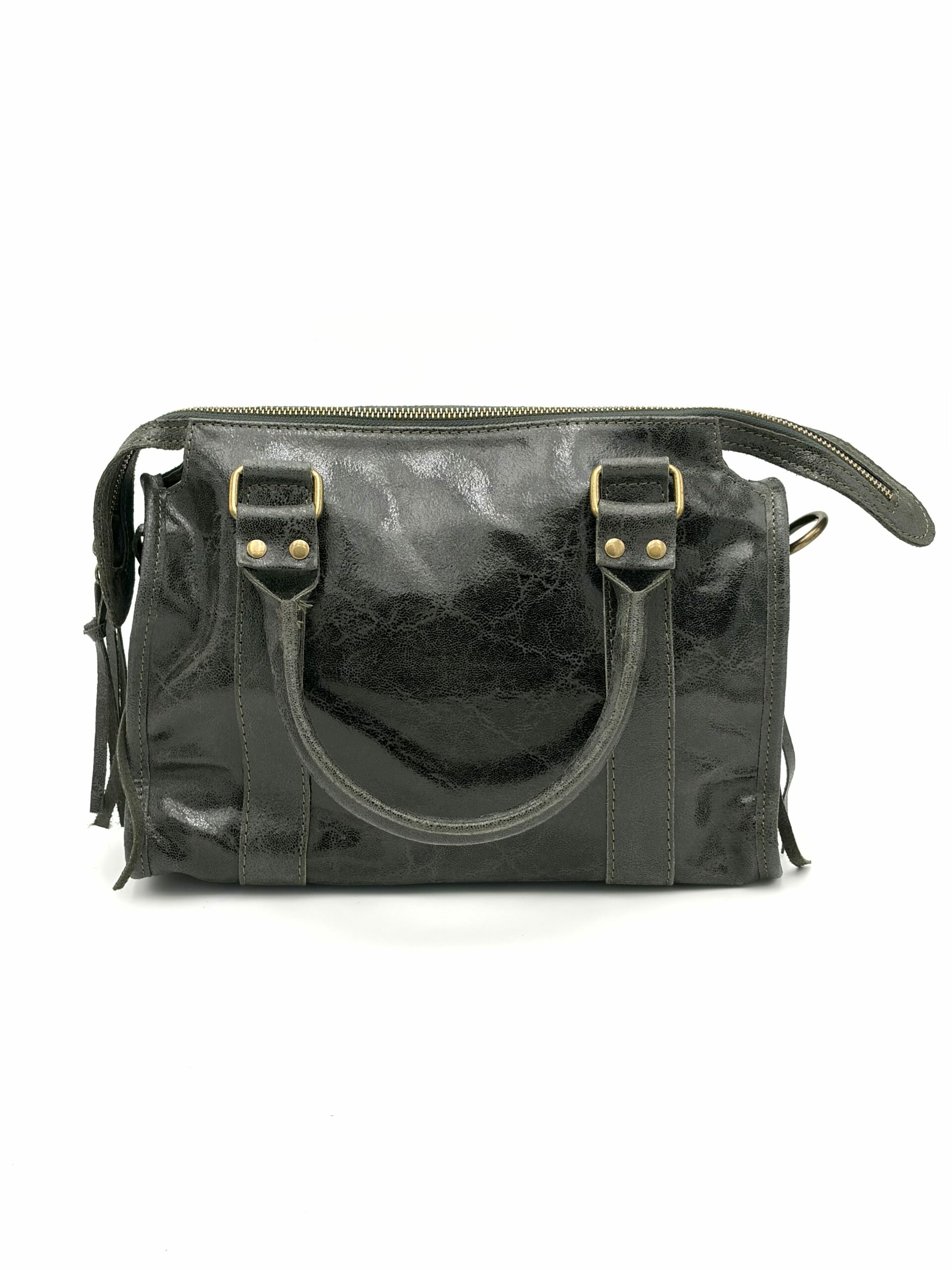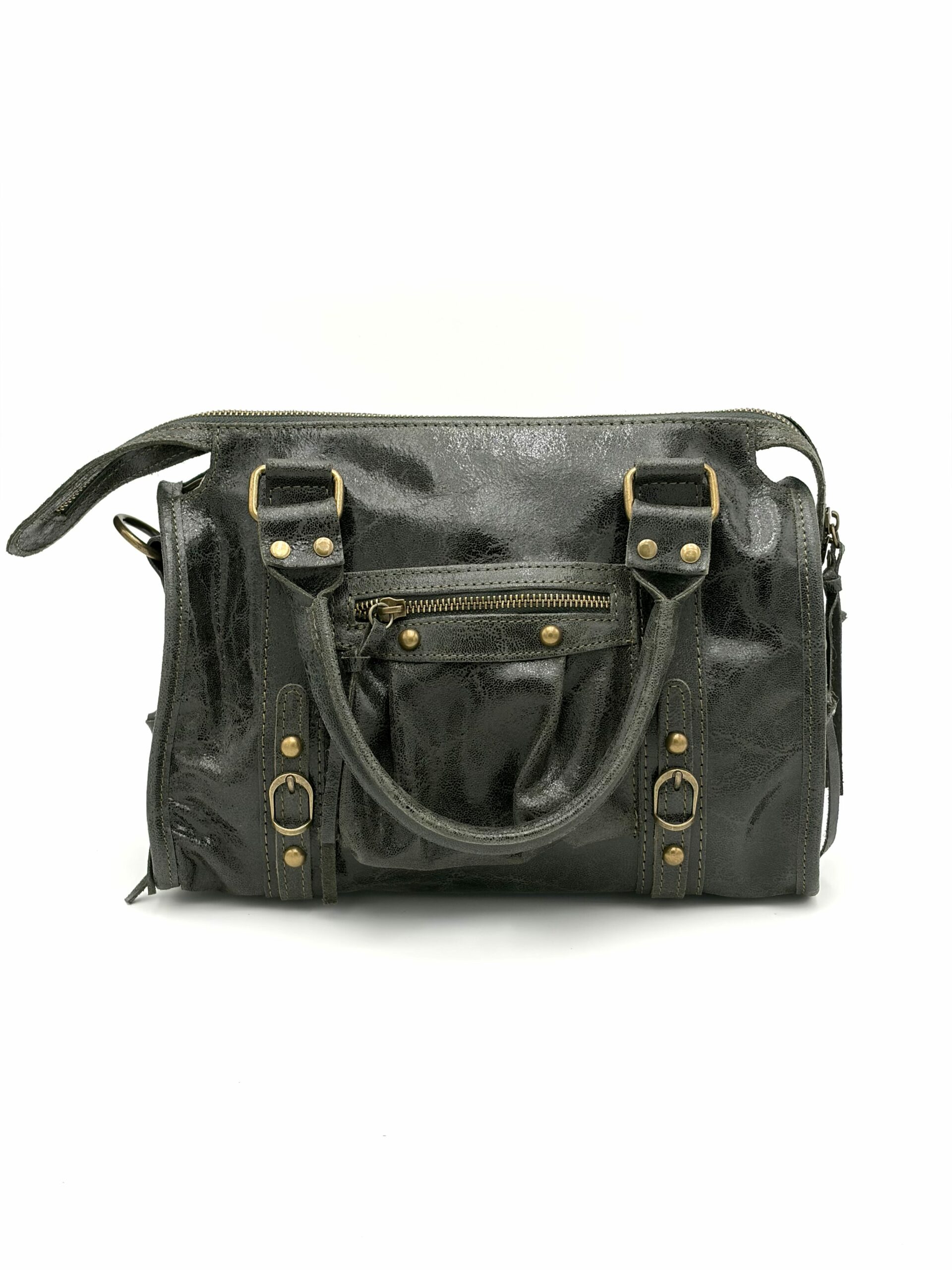 Pelle di vitello vegetale Realizzata in Italia Grigio e Verde Chiusura con zip Tracolla regolabile