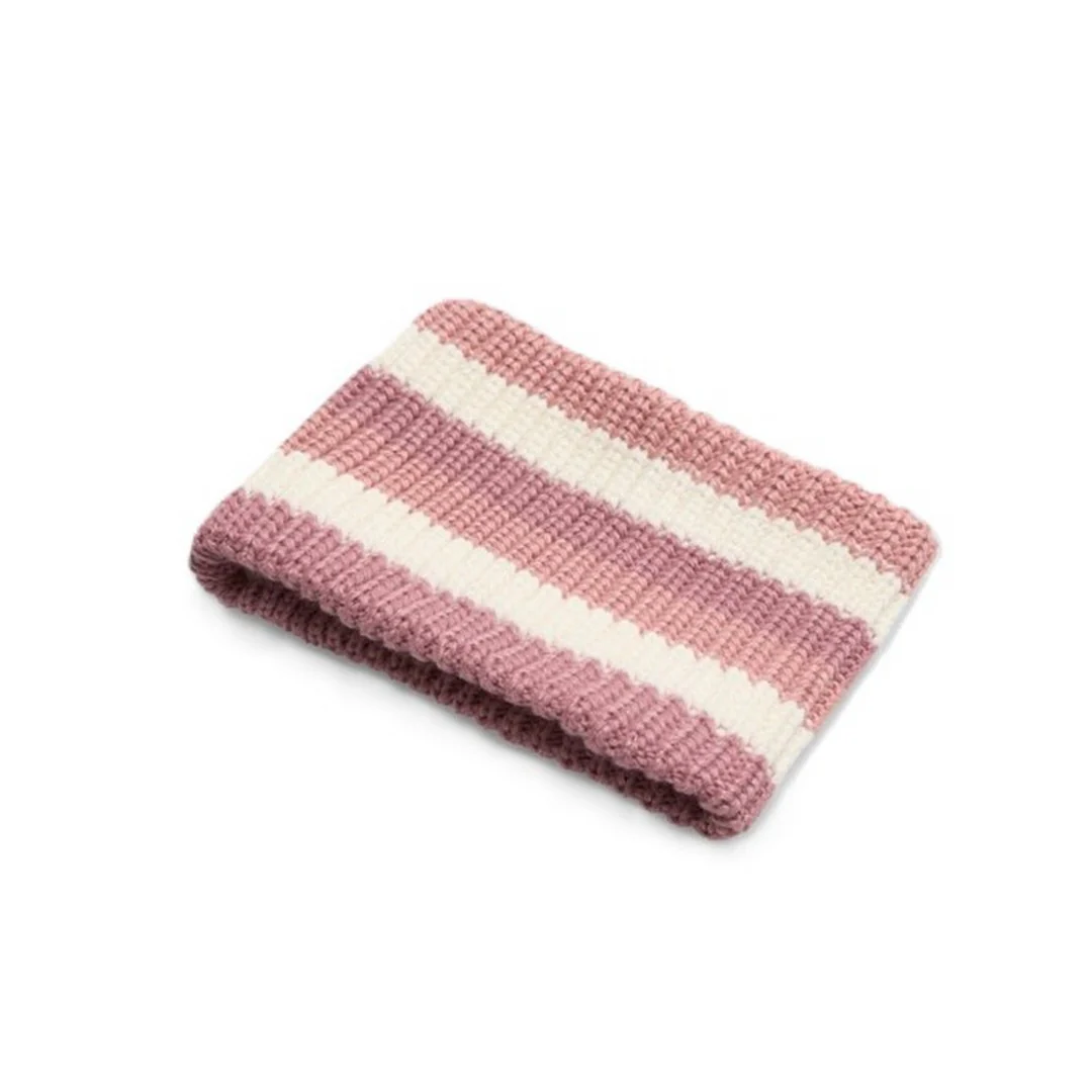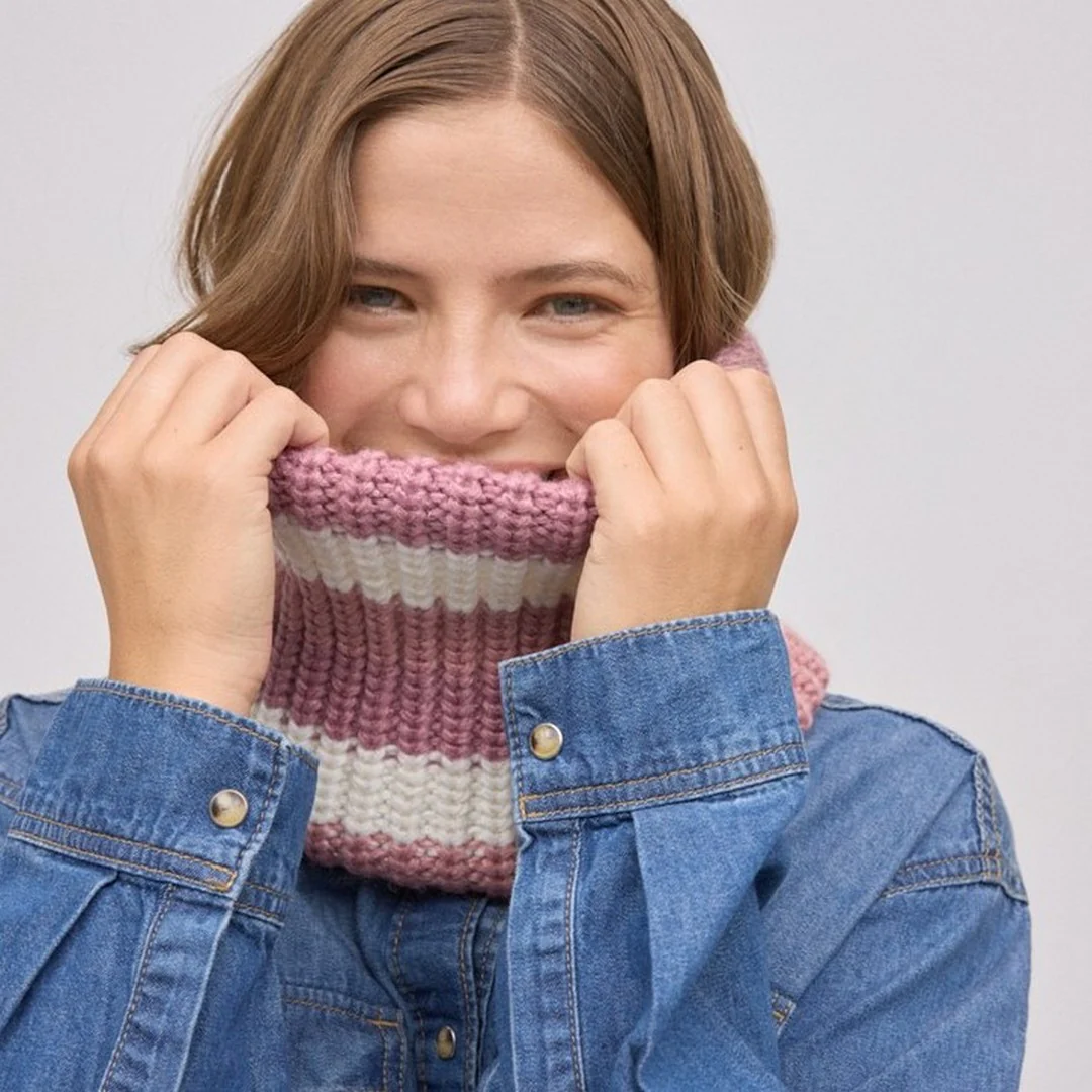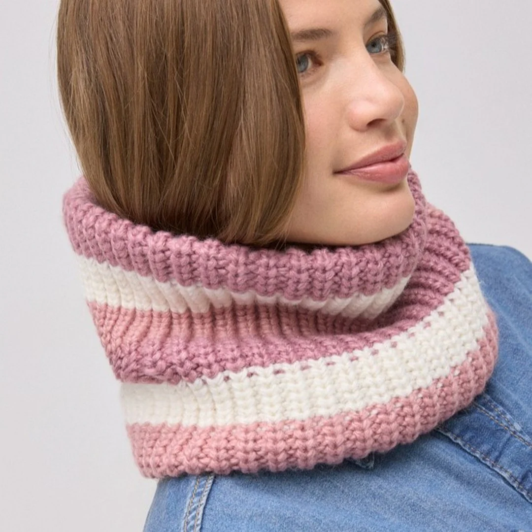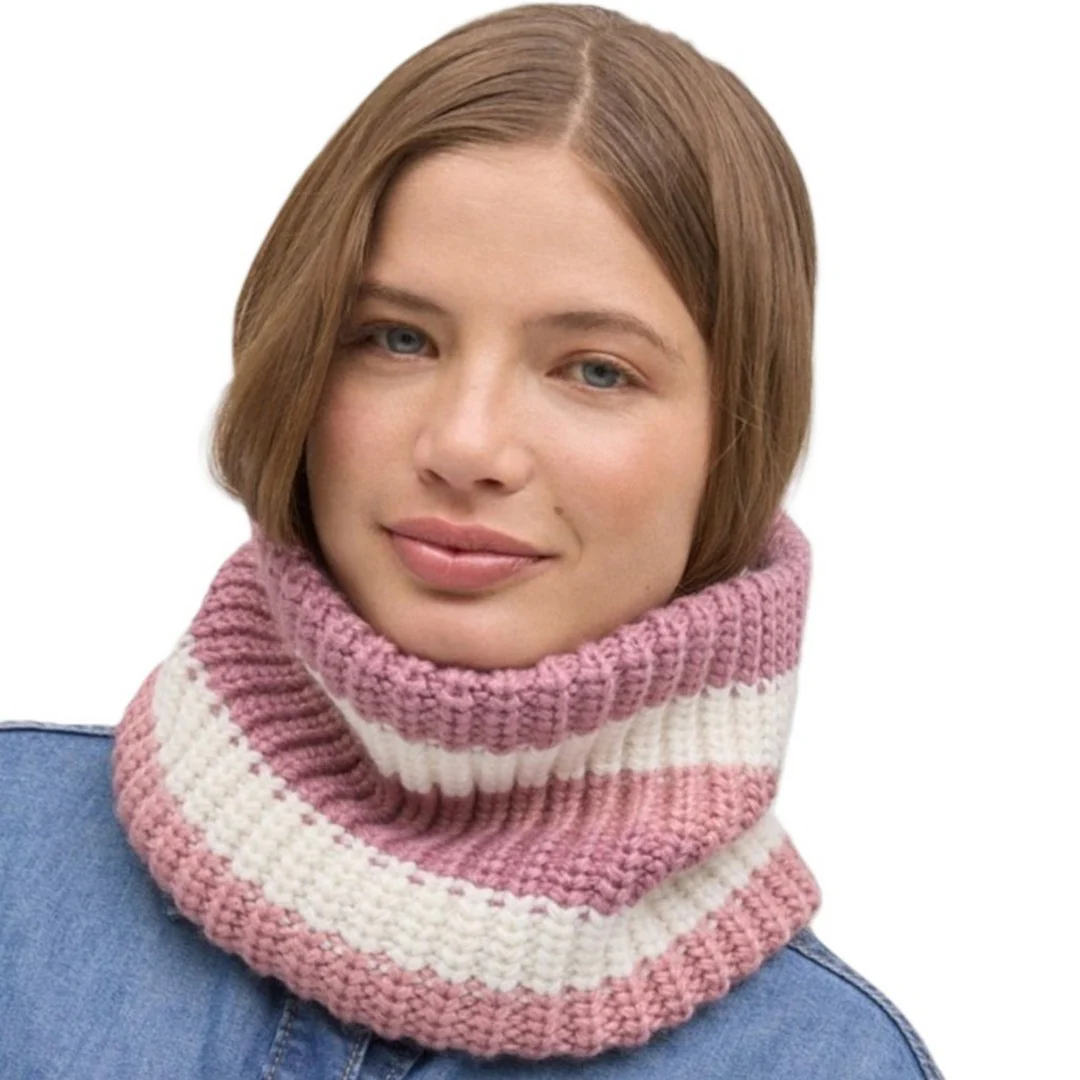 Questa sciarpa infinity con motivo a righe si adatta comodamente al collo grazie al suo design ad anello, offrendo comfort e protezione nelle giornate fredde.