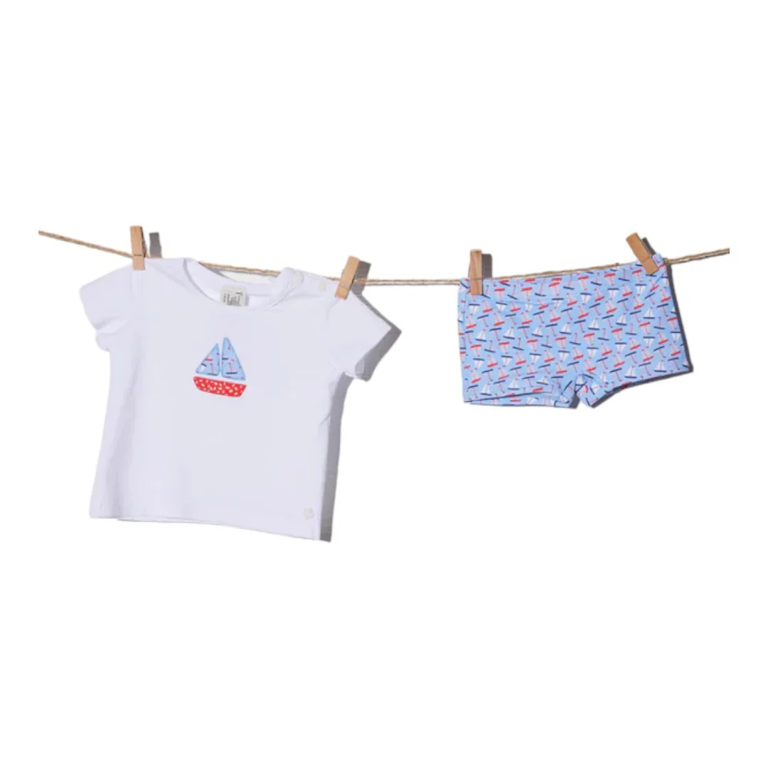 Collezione Baby Swim. Al mare. Set composto da costume da bagno stile boxer e maglietta a maniche corte abbinata. Stampa a barchetta. 93% Cotone, 7% Spandex.