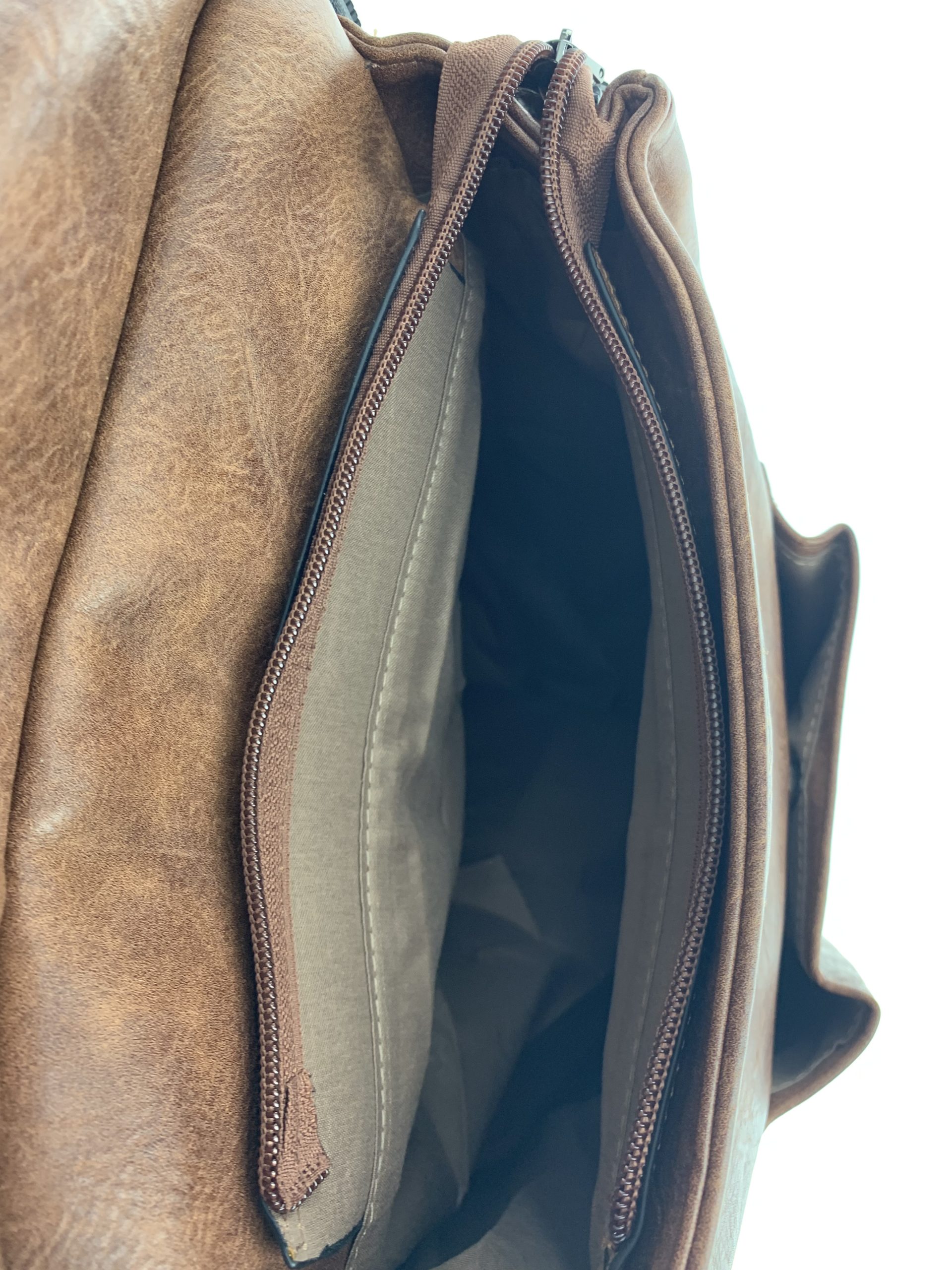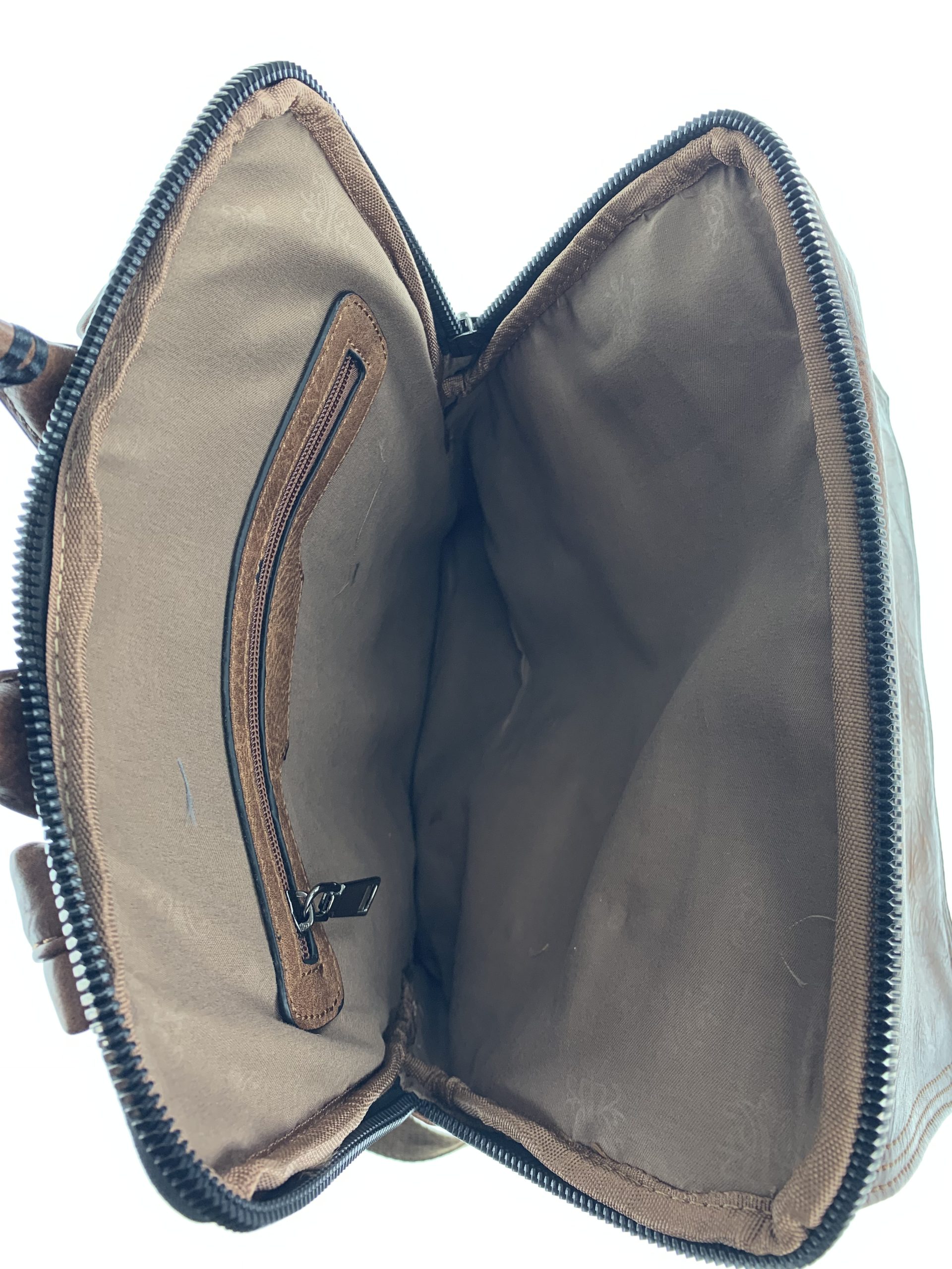 L’apertura della parte principale posteriore ย รจ con cerniera ย di 52 cm con tira lampo in metallo brunito, all’interno ampia tasca con zip.