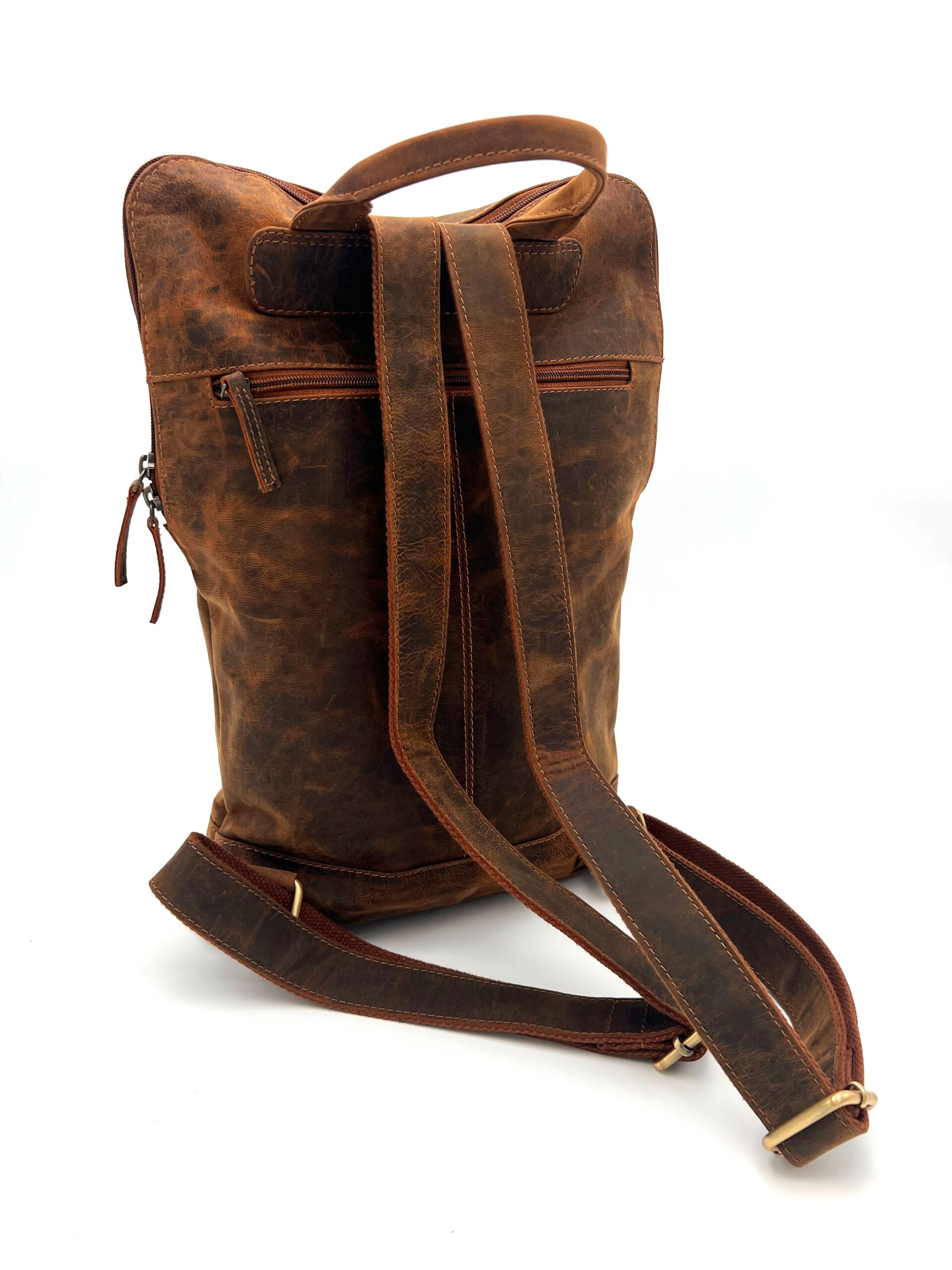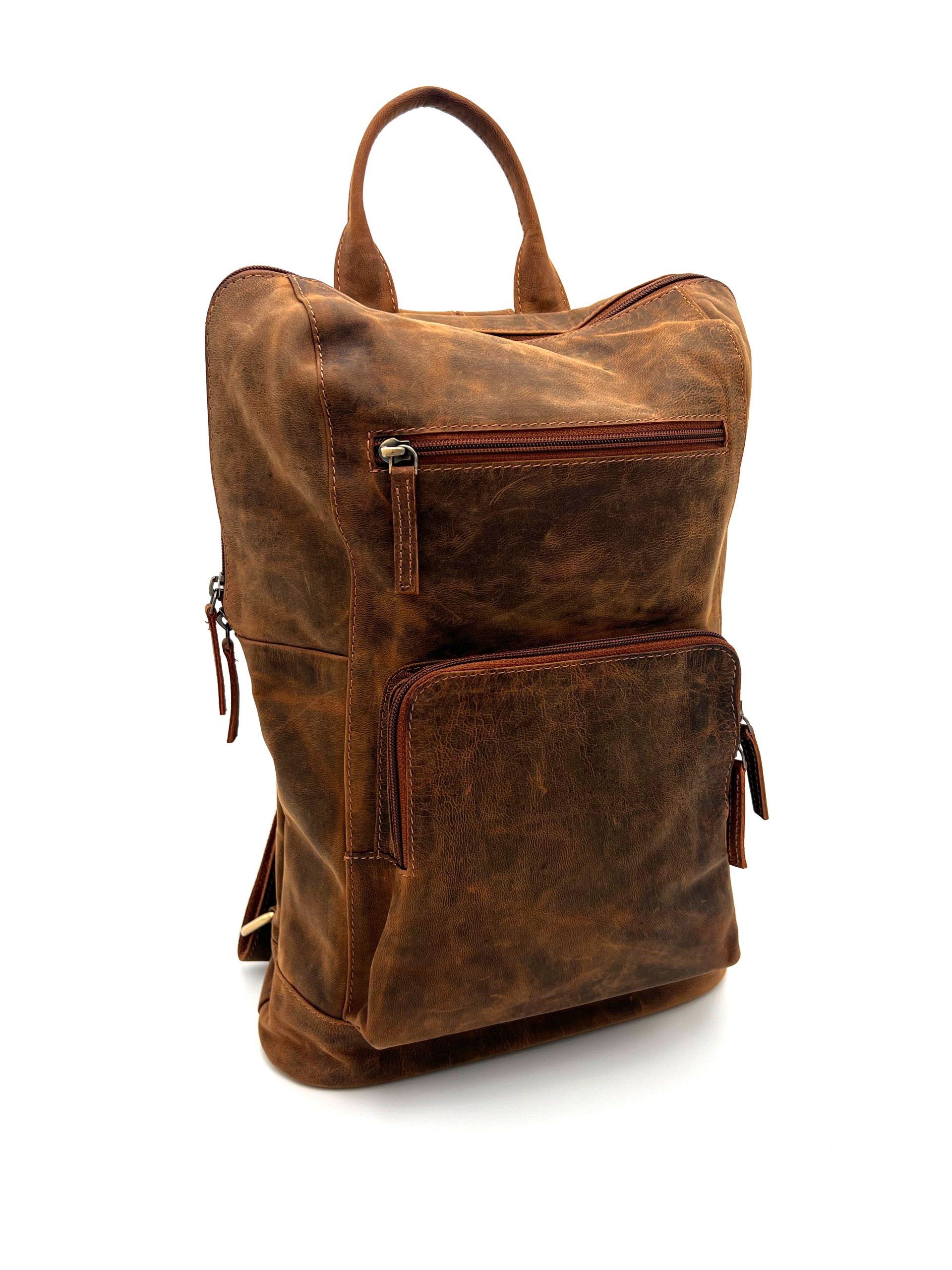 Zaino vintage in pelle vegetale, invecchiata e opaca. Il pellame viene sottoposto a dei lavaggi specifici durante la produzione che donano un carattere distintivo, conferendo al prodotto un aspetto più ricercato.