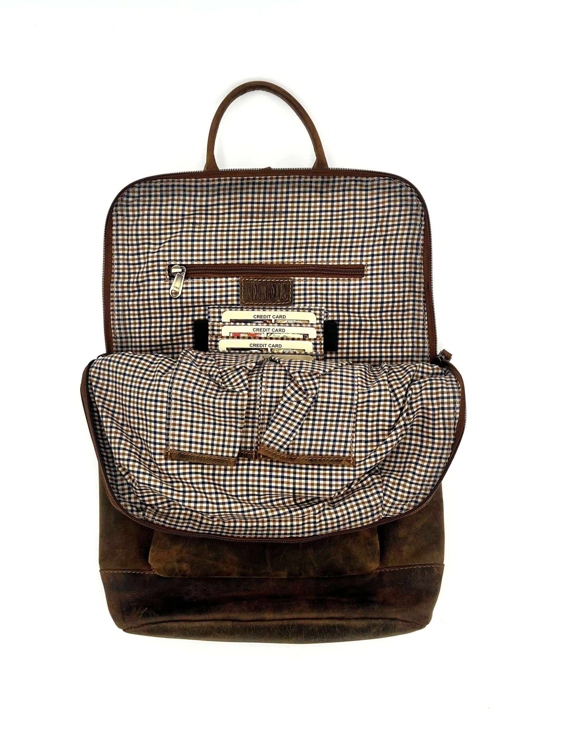 Pelle di vitello vegetale, invecchiata e opaca Marrone Due tasche frontali esterne con zip Una tasca interna con zip Portacarte interno dotato di cinque scomparti Due portapenne interni Fodera interna a quadri