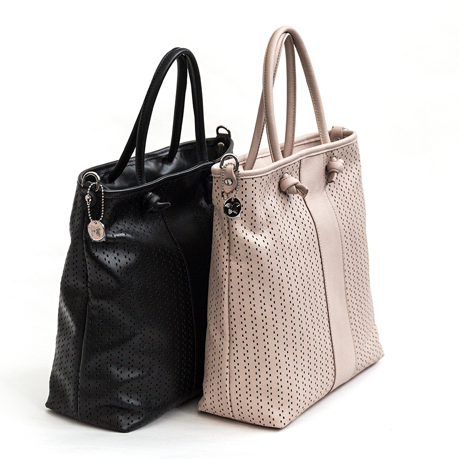 Borsa shopping a due manici annodati con tracolla applicabile in pregiata pelle nappa forata a taglio laser. Chiusura a zip con interno foderato con tasche. Accessori color argento.